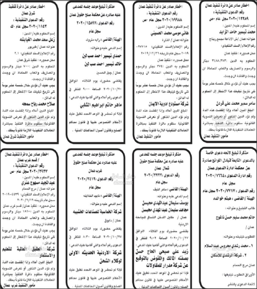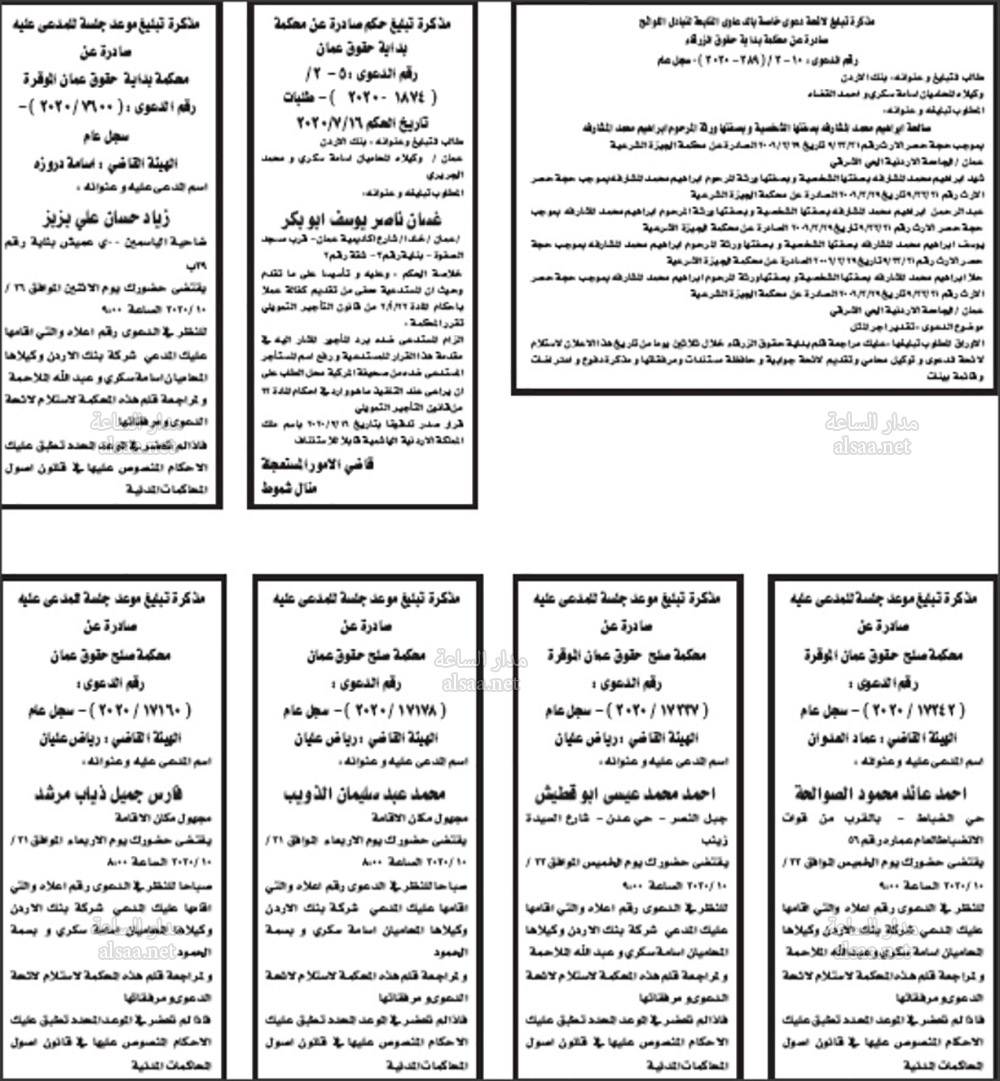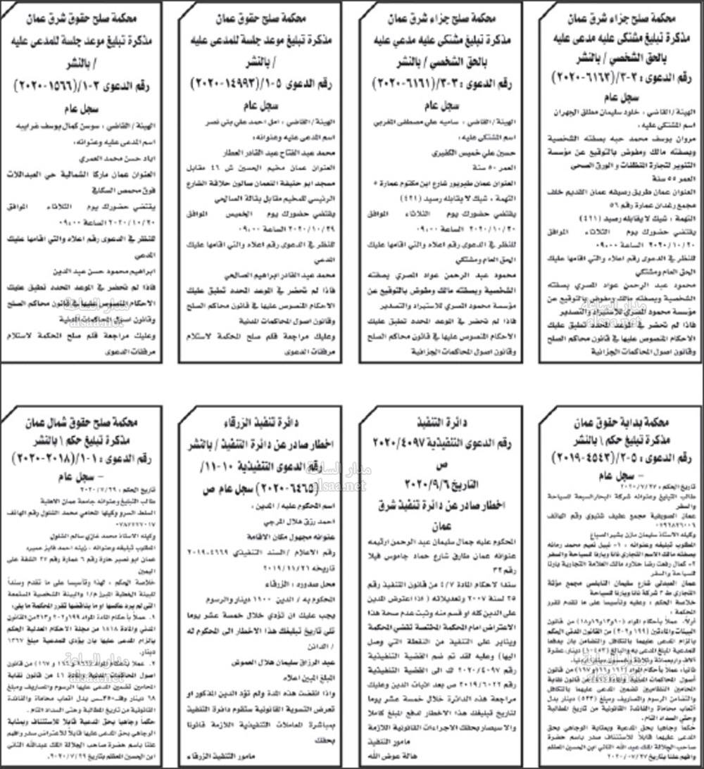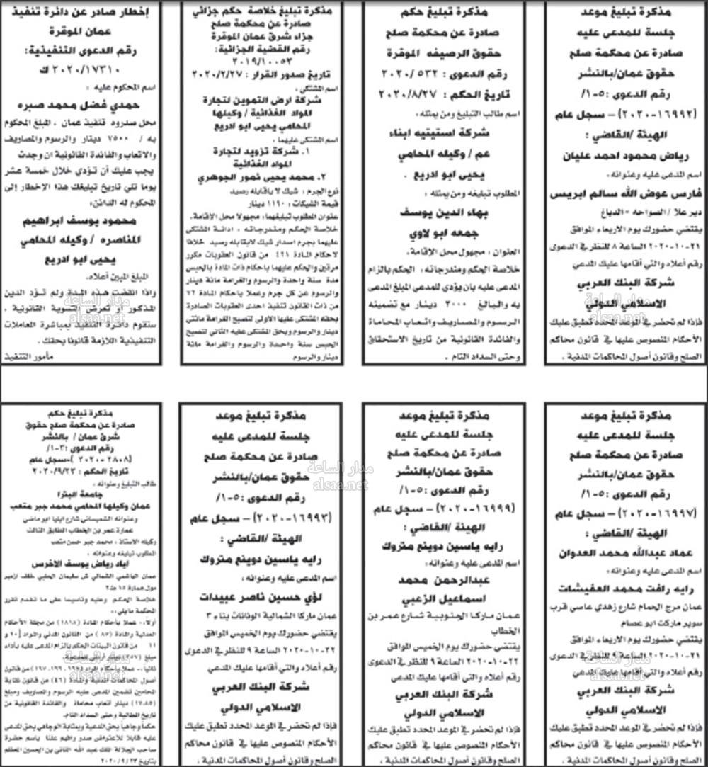 أعلنت محاكم الخميس 15/ 10 / 2020 عن مذكرات تبليغ مواعيد جلسات المحاكمة للمشتكى عليهم المذكورين تاليا.