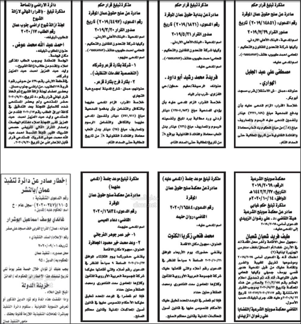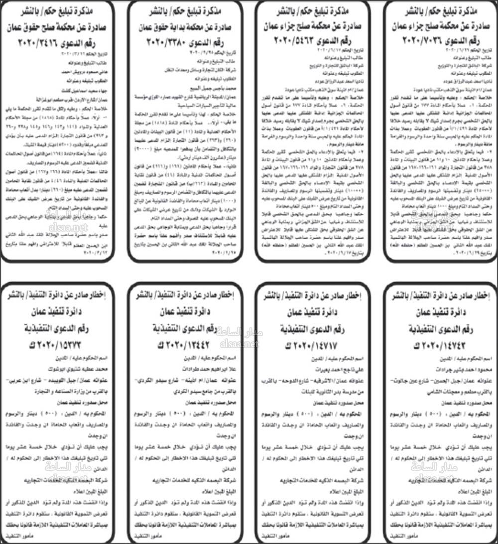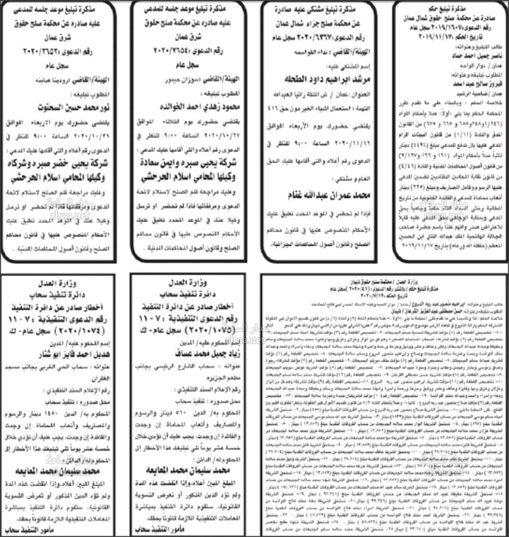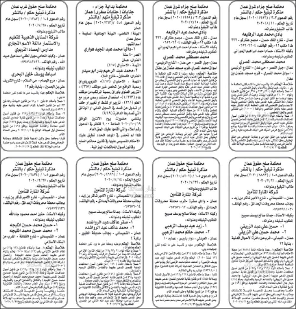أعلنت محاكم الخميس 15/ 10 / 2020 عن مذكرات تبليغ مواعيد جلسات المحاكمة للمشتكى عليهم المذكورين تاليا.