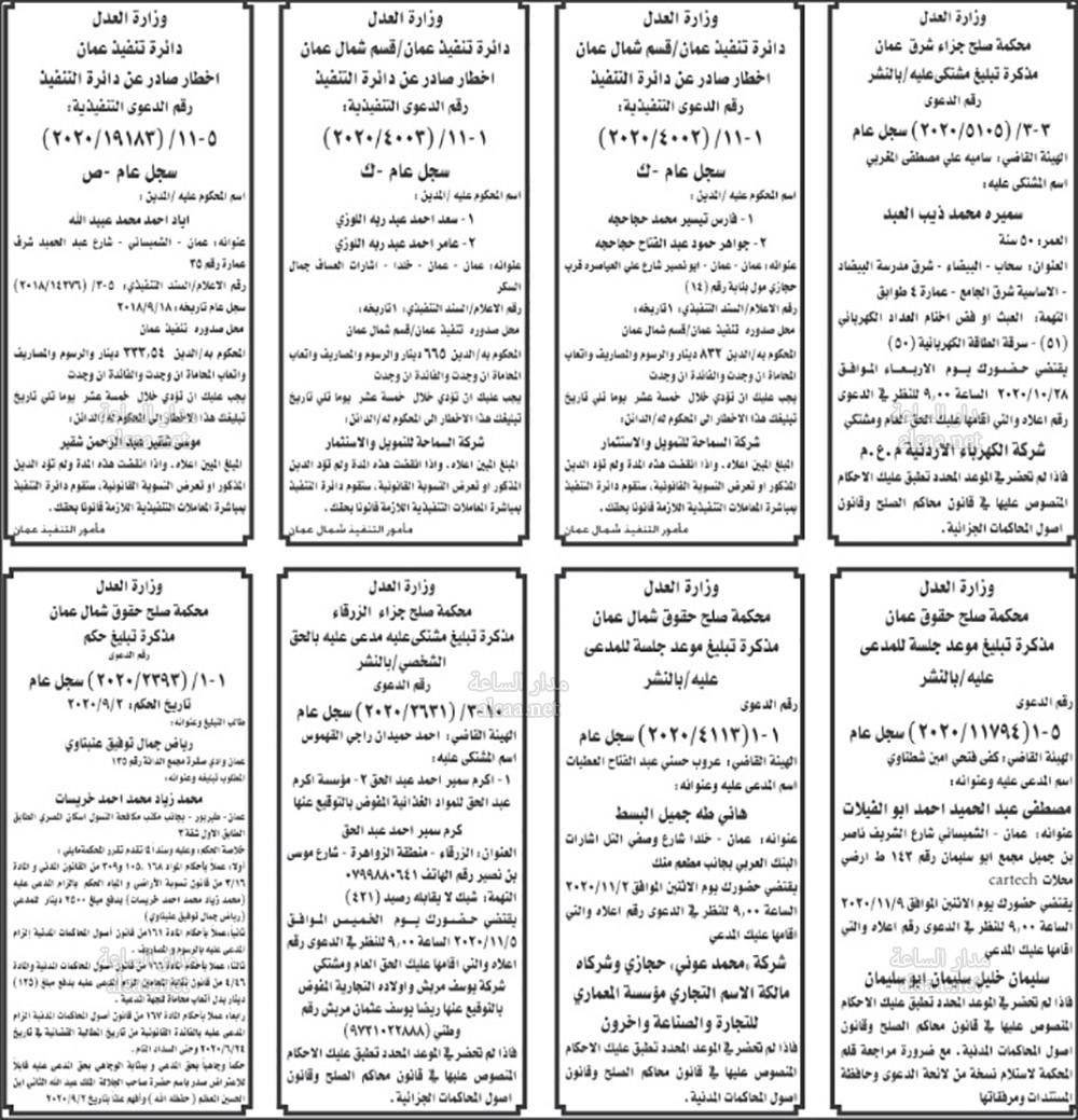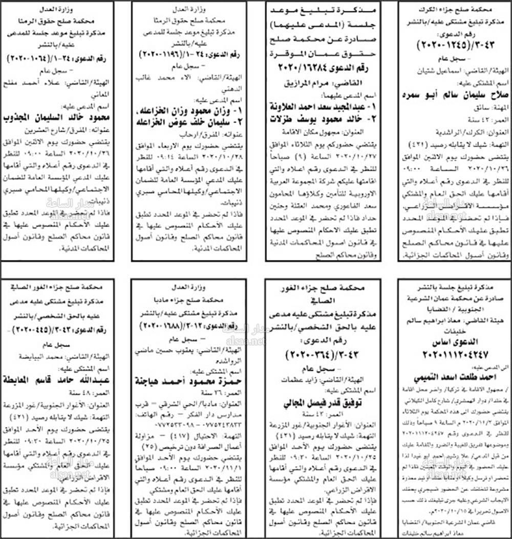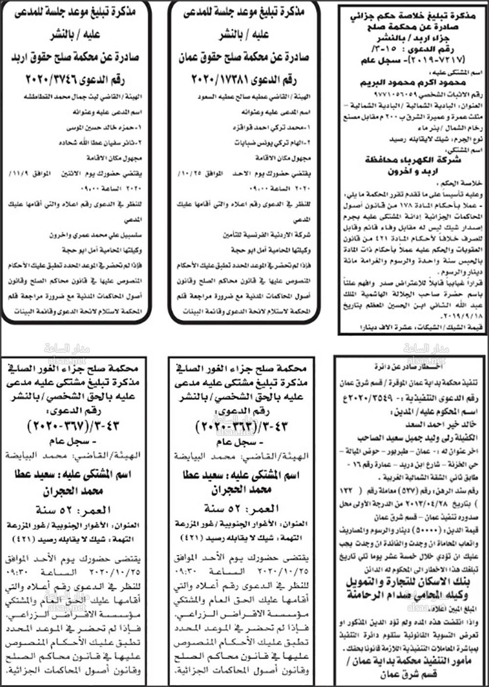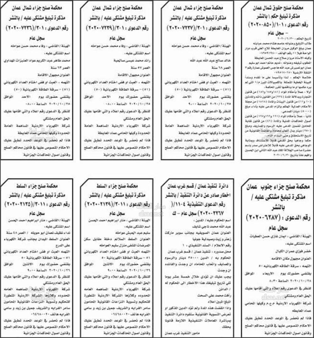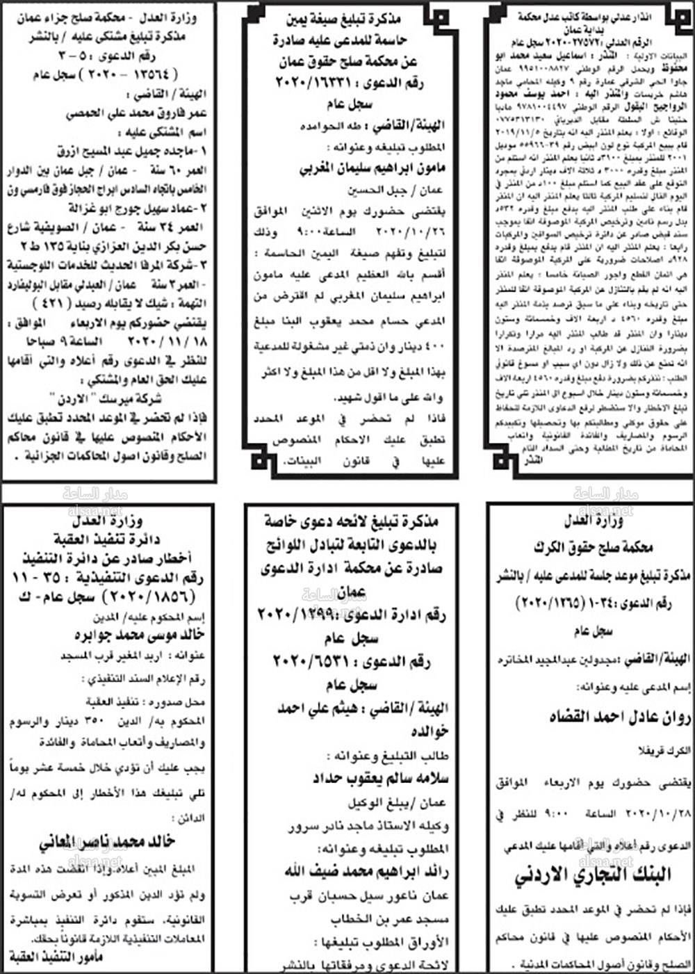 أعلنت محاكم اليوم الأربعاء 21/ 10 / 2020 عن مذكرات تبليغ مواعيد جلسات المحاكمة للمشتكى عليهم المذكورين تاليا.