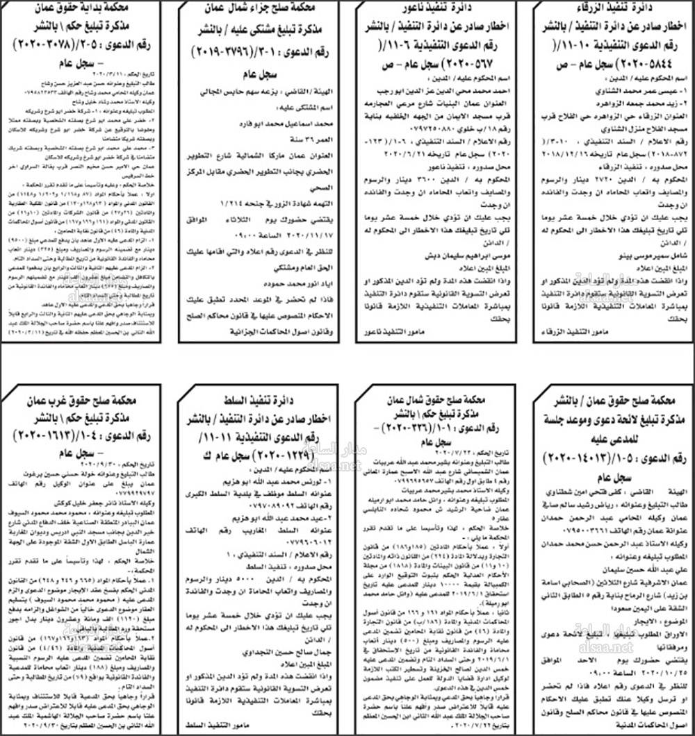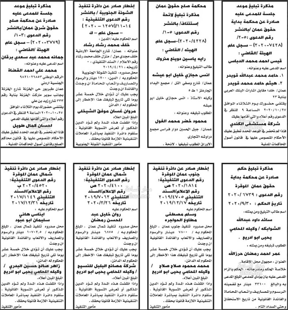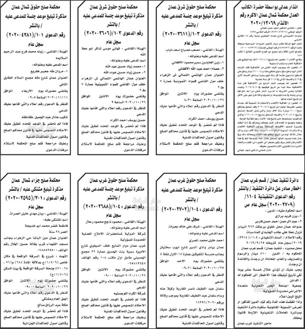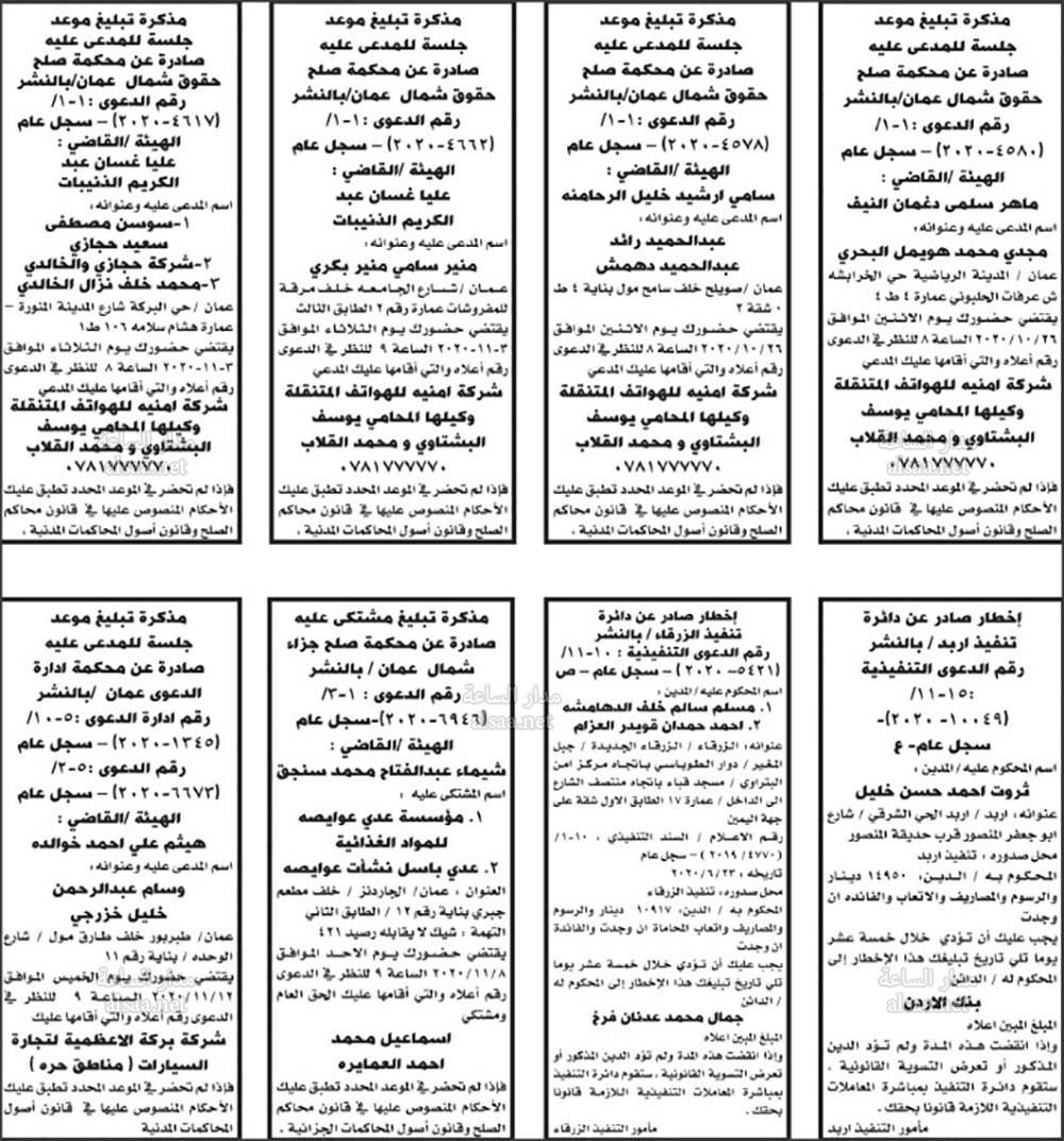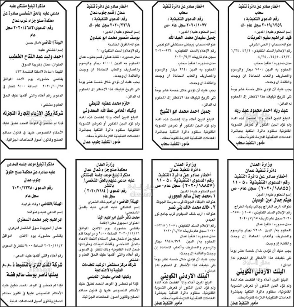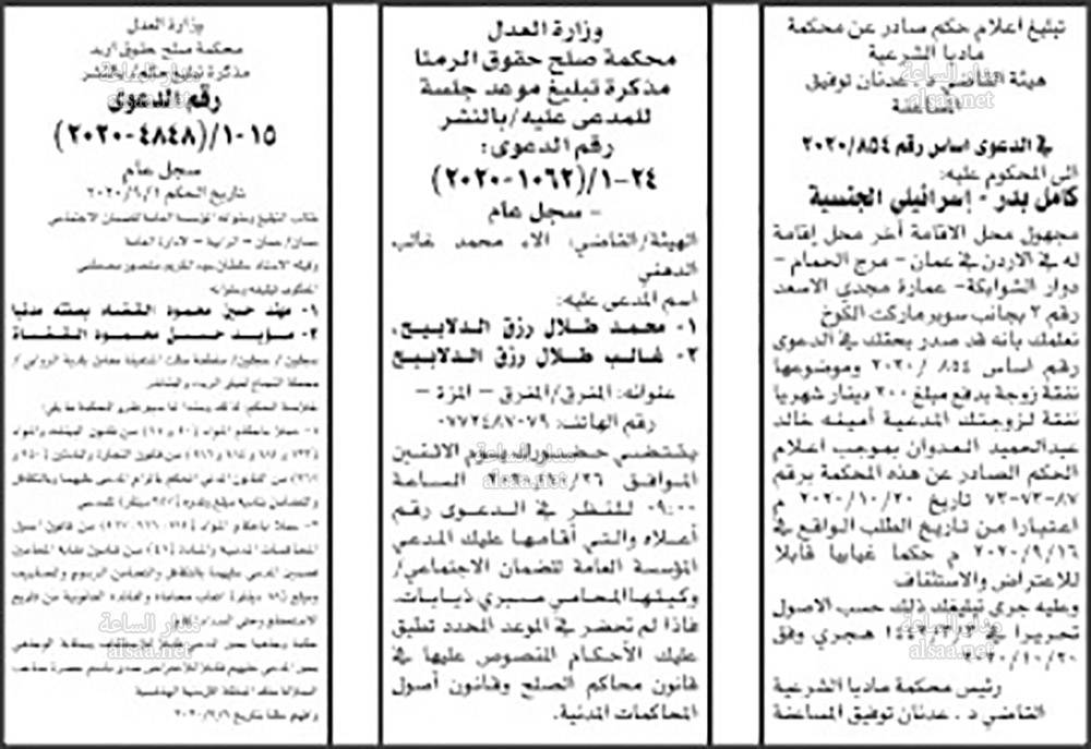 أعلنت محاكم اليوم الأربعاء 21/ 10 / 2020 عن مذكرات تبليغ مواعيد جلسات المحاكمة للمشتكى عليهم المذكورين تاليا.