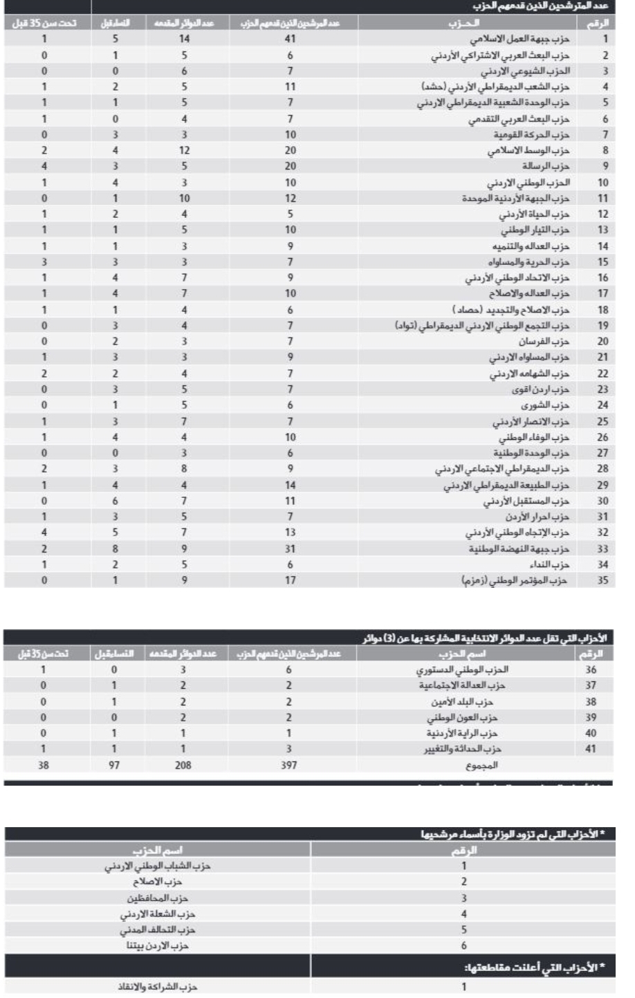 وبحسب الجداول، فقد بلغ مجموع المترشحين 397 مترشحاً للانتخابات بما نسبته 23 بالمئة من إجمالي المترشحين بالمملكة والبالغ عددهم 1690 مترشحاً ومترشحة، بينهم 97 مترشحة بنسبة 24 بالمئة من مترشحي الأحزاب ونسبة 26 بالمئة من المترشحات بالمملكة والبالغ عددهن 364 مترشحة، فيما بلغت نسبة الزيادة في أعداد السيدات المترشحات مقارنة مع انتخابات 2016 بلغت 4ر44 بالمئة، وبلغ عدد المترشحين الشباب الحزبيين 38 مترشحاً ومترشحة تراوحت أعمارهم بين 30-35 سنة.