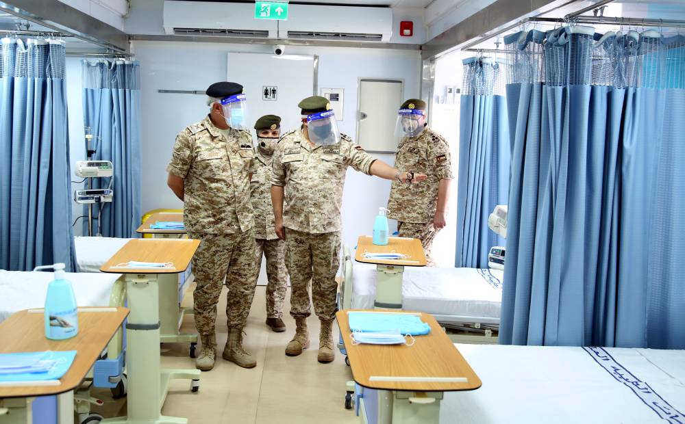وأكد رئيس هيئة الأركان المشتركة على ضرورة تعزيز قدرات الخدمات الطبية الملكية لمواجهة الفيروس من خلال تزويد مستشفى الأمير راشد بن الحسن في إربد ومستشفى الأمير هاشم بن الحسين في الزرقاء، بمستشفيات ميدانية متحركة وبطاقة استيعابية تصل لنحو 200 سرير لكل مستشفى.
