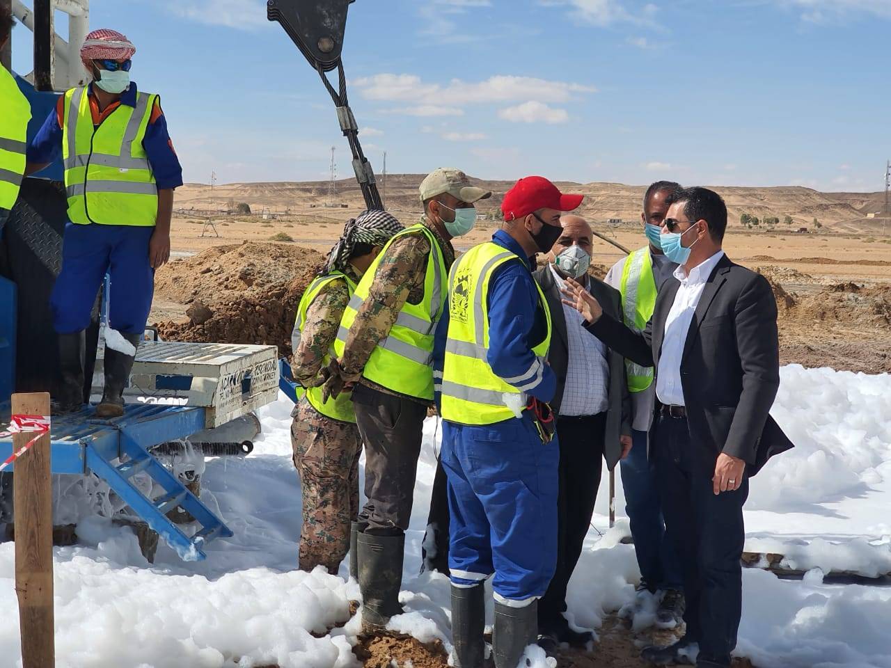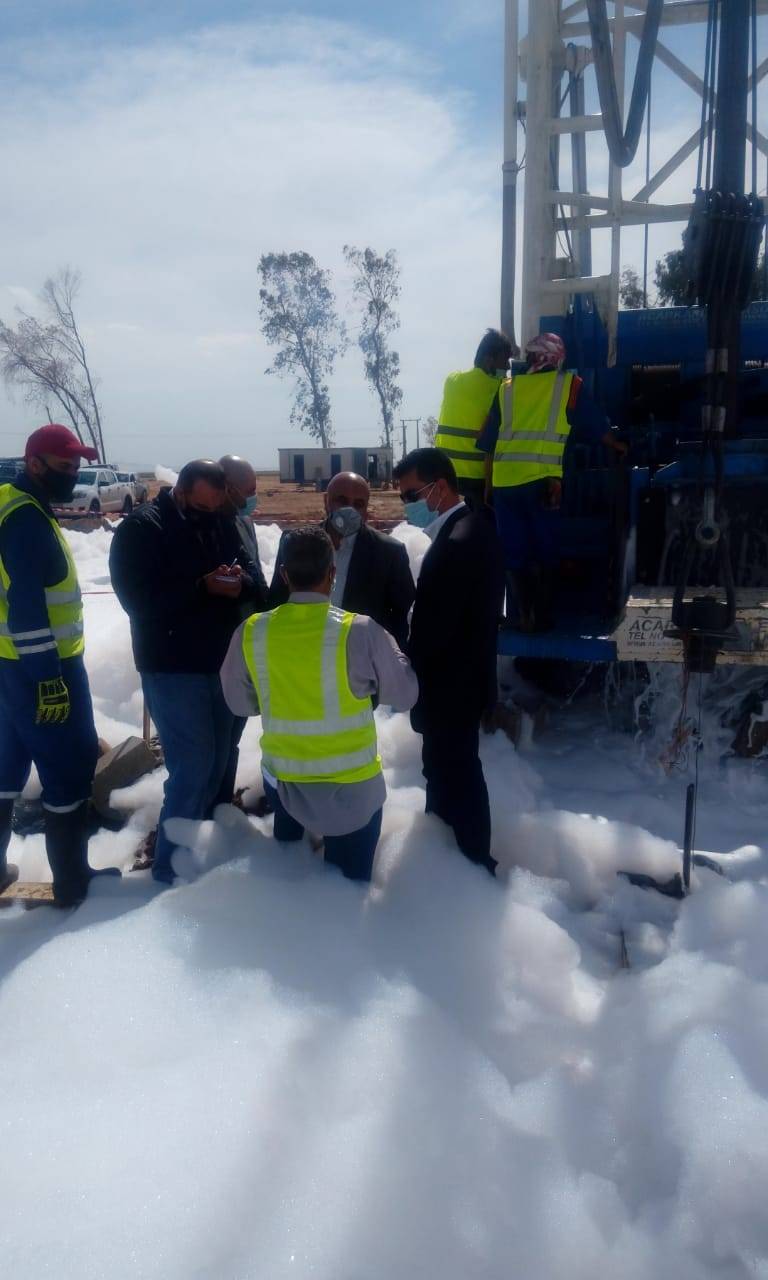 واستهل الدكتور معتصم سعيدان زيارته الى مواقع الحفارات التي تعمل في منطقة المدورة حيث اطلع على عملية الحفر باستخدام طريقة الحفر بالهواء واستخدام سائل ( الفوم )في الحفارة الاولى وكذلك زيارة الحفارة الثانية التي تعمل بطريقة الحفر باستخدام البنتونيت واستمع الى شرح من مدير الحفر المهندس سليمان الخطيب وطاقم الحفارة عن آلية العمل لحفر الابار والمشاكل والعقبات التي تواجههم لتنفيذ الاعمال المطلوبة ضمن برنامج الحفر بالوقت المناسب واشار مدير الحفر خلال جولة الوزير لتفقد استكمال حفر الابار للمشاريع الزراعية بان انجاز البئر الاول سيكون بحلول منتصف الشهر القادم بطاقة (250) متر مكعب /الساعة كحد ادنى وقد تصل انتاجية البئر الى حوالي ٥٠٠ متر مكعب بالساعة اما بالنسبة للبئر الثاني فمن المتوقع الانتهاء منه بحلول نهاية العام الحالي بنفس الطاقة و أوعز الوزير الى الامين العام لسلطة المياه المهندس احمد عليمات باتخاذ كافة الاجراءات اللازمة للاسراع في إنجاز عملية الحفر ضمن المواصفات المطلوبة من خلال تأمين كادر إضافي لمواصلة الحفر على مدار الساعة وتذليل كافة العقبات التي تواجه عملية حفر الابار وبضرورة توفير كافة المستلزمات اولا باول ضمن خطة عمل واضحة المعالم لتحقيق الرؤيا الملكية المتمثلة بالنهوض بالقطاع الزراعي .