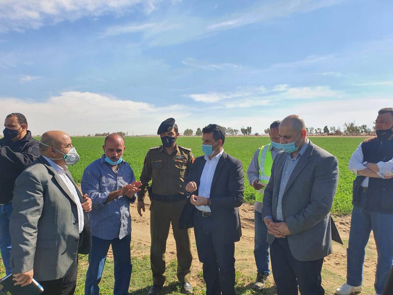 واطلع الوزير عن كثب على مشاريع الحق الزراعية للمجتمع المحلي بمساحة (1750) دونم منوها ان الاردن يمكن ان يتصدر انتاج زراعة الاعلاف بالاستفادة من المياه المعالجة الناتجة عن محطات الصرف الصحي حيث اوضح م. طالب الدباس انه تم توحيد جميع جمعيات المنطقة ال(25) تحت جمعية المدورة وتوزيع وحدات بمساحة (25) دونم و تجهيز البنية التحتية واستخدام المعدات الزراعية الحديثة المستخدمة في حصاد المحصول من شبكة ري وبرك وسياج وحضائر أغنام وتسليمها للمواطنين شريطة ان يعملوا فيها لزراعة الذرة العلفية والاعلاف ومشروع الحق الزراعي بمساحة( 4000) دونم المزروعة بالبرسيم والعشبة العلفية وذرة علفية والقمح بمعدل (1000) دونم وتشغيل (23) شخص من الاهالي حيث يحقق الدونم الواحد نحو (500) دينار سنويا .