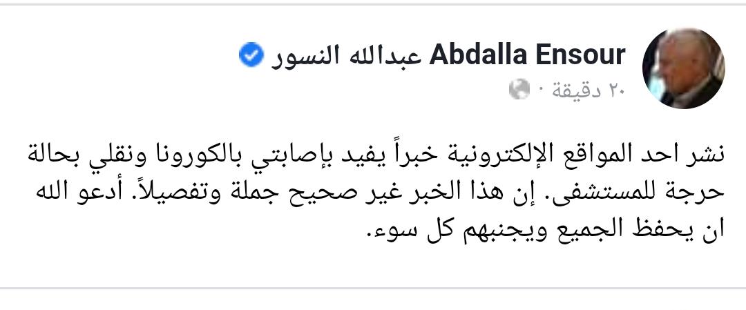 نفى رئيس الوزراء السابق عبدالله النسور عبر منشور له على صفحته الرئيسية الفيس بوك إصابته بفيروس كورونا .