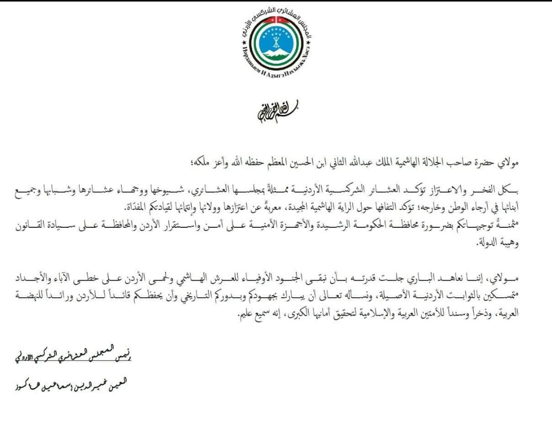 المجلس العشائري الشركسي الاردني يوجه رسالة للملك
