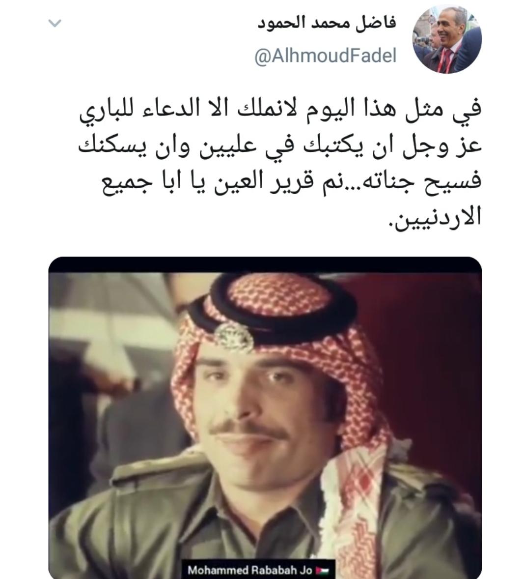 كتب الباشا فاضل الحمود مدير الأمن العام السابق على صفحته في موقع التواصل تويتر، في ذكرة ميلاد الباني الحسين بن طلال رحمه الله: