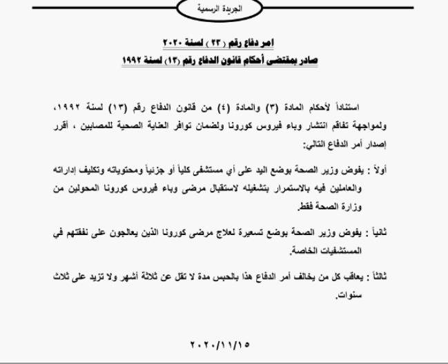ويسمح امر الدفاع الجديد لوزير الصحة بوضع اليد على أي مستشفى كليا أو جزئيا ومحتوياته وتكليف ادارته والعاملين فيه بالاستمرار بتشغيله لاستقبال حالات كورونا.