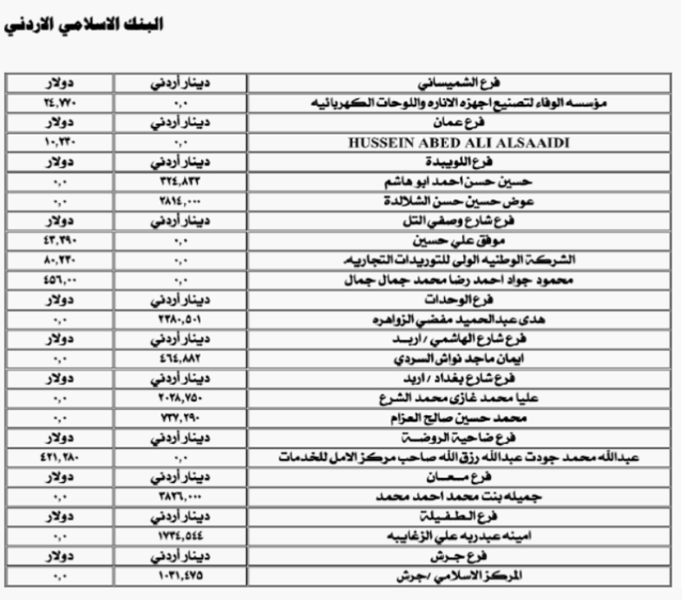 قال البنك الاسلامي الاردني ، ان اموال الاشخاص (المرفقة أسمائهم في اسفل الخبر)، ستحال الى خزينة الدولة ، استنادا قانون تملك الحكومة الاموال التي يلحقها التقادم.