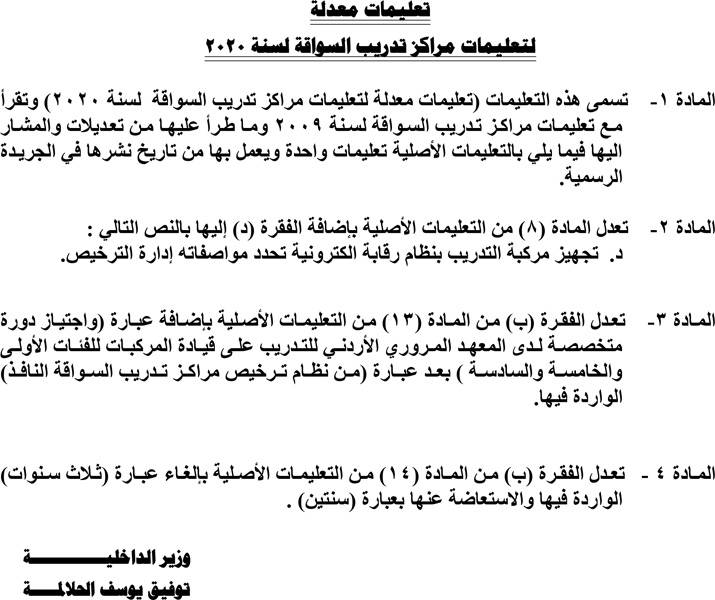 اشترطت الحكومة في تعديلات على تعليمات مراكز تدريب السواقة لعام  ،2020 تجهيز المركبات بنظام رقابة الكترونية ، تحدد مواصفاته إدارة الترخيص.