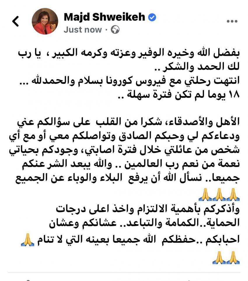شويكة تعلن تعافيها من كورونا قائلة : إنتهت رحلتي بسلام