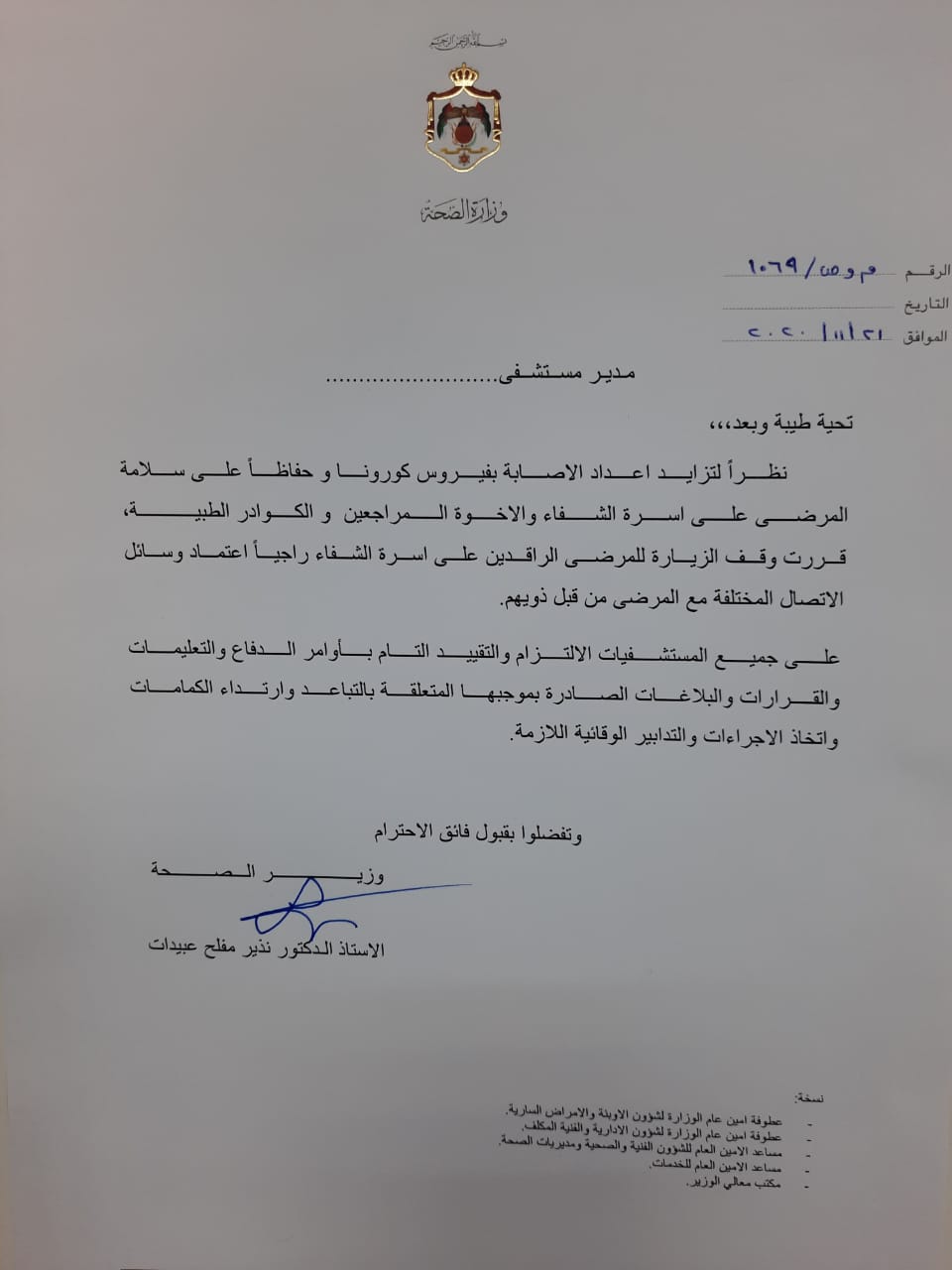 وبين عبيدات أنه نظرًا لتزايد اعداد الإصابات بفيروس كورونا و حفاظًا على سلامة المرضى الذين هم يرقدون على أسرة الشفاء والمراجعين والكوادر الطبية أنه تقرر وقف الزيارة للمرضى واعتماد وسائل الاتصال المختلفة مع المرضى من قبل ذويهم .