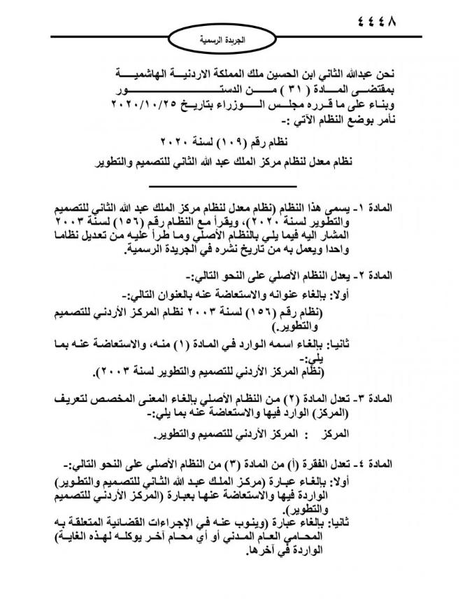 كما عٌدل بحسب الإرادة، تعريف المركز الوارد في المادة الثانية من النظام الأصلي، ليصبح: "المركز: المركز الأردني للتصميم والتطوير".