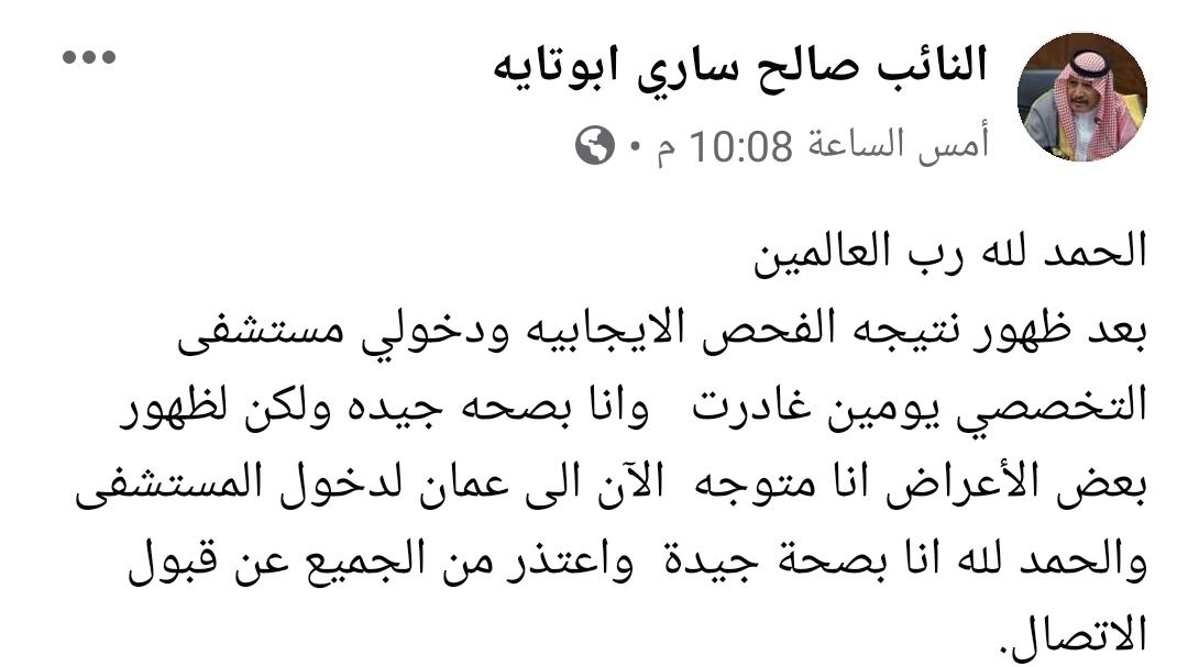 وفي ذات السياق نشر النائب ابو تايه منشورًا له عبر صفحته بالفيس بوك مؤكدًا من خلاله  أنه في صحة جيدة مشيرًا إلى انه قد ظهرت عليه بعض الأعراض وبعد ذلك قد توجه  إلى المستشفى في العاصمة عمان لتلقي العلاج .