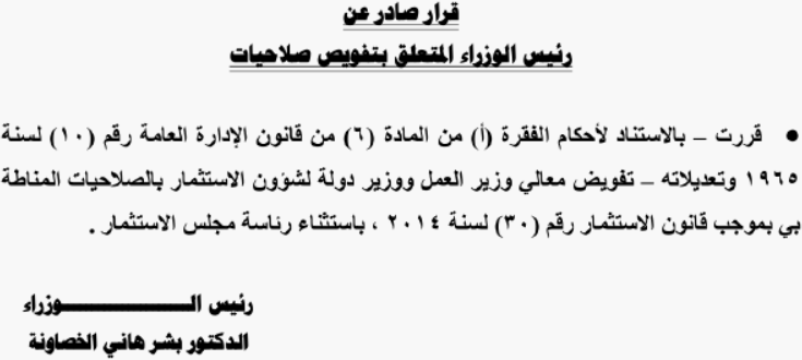 واستثنى التفويض رئاسة مجلس الاستثمار ، وذلك بحسب ما جراء في الجريدة الرسمية الثلاثاء.