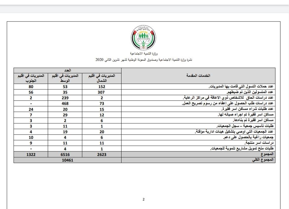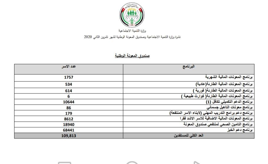 وبلغ مجموع المستفيدين من مديريات الوزارة ( 10461 ) اسرة خلال شهر تشرين الثاني، كما استفاد من خدمات صندوق المعونة الوطنية (109.813) الف اسرة خلال ذات الشهر.