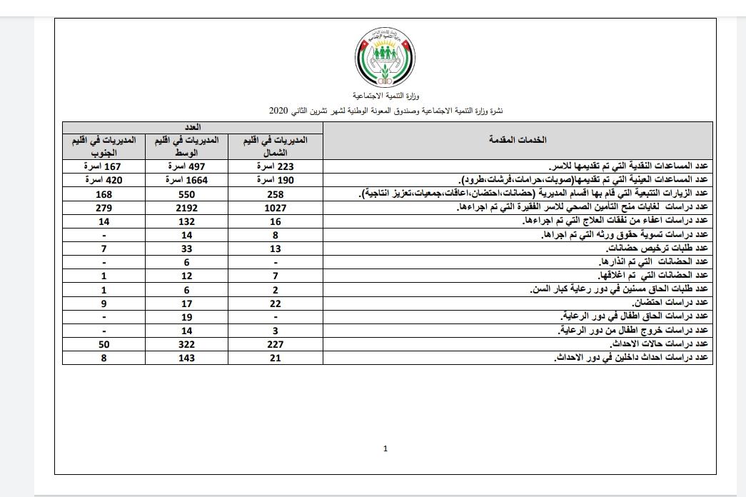 التنمية الاجتماعية تصدر التقرير الشهري للخدمات والاعمال التي تم تنفيذها خلال تشرين الثاني الماضي