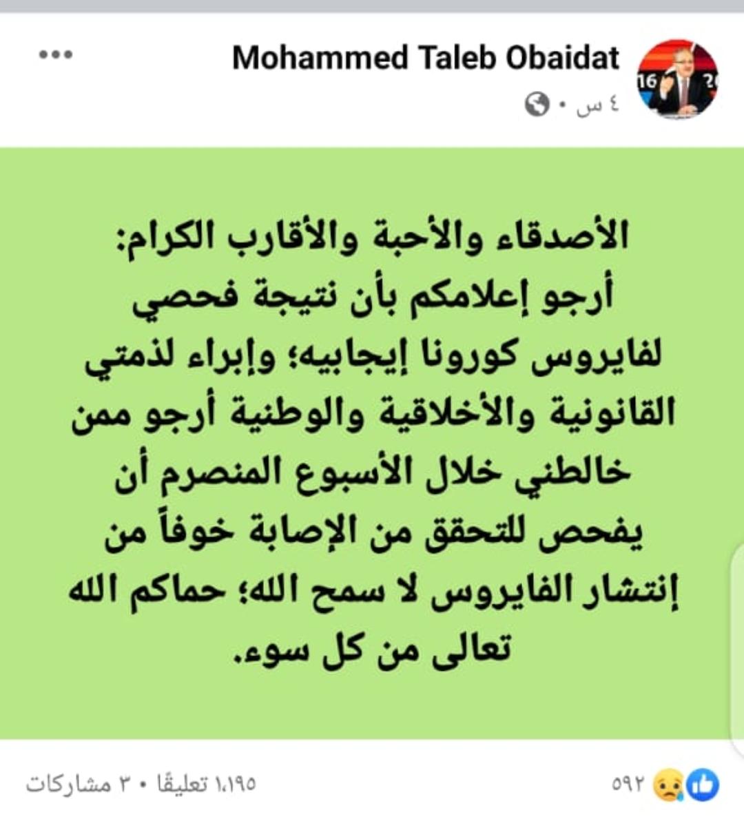 أعلن الوزير الأسبق للأشغال العامة والإسكان و رئيس جامعة جدارا الدكتور محمد طالب عبيدات عن اصابته بفيروس كورونا.