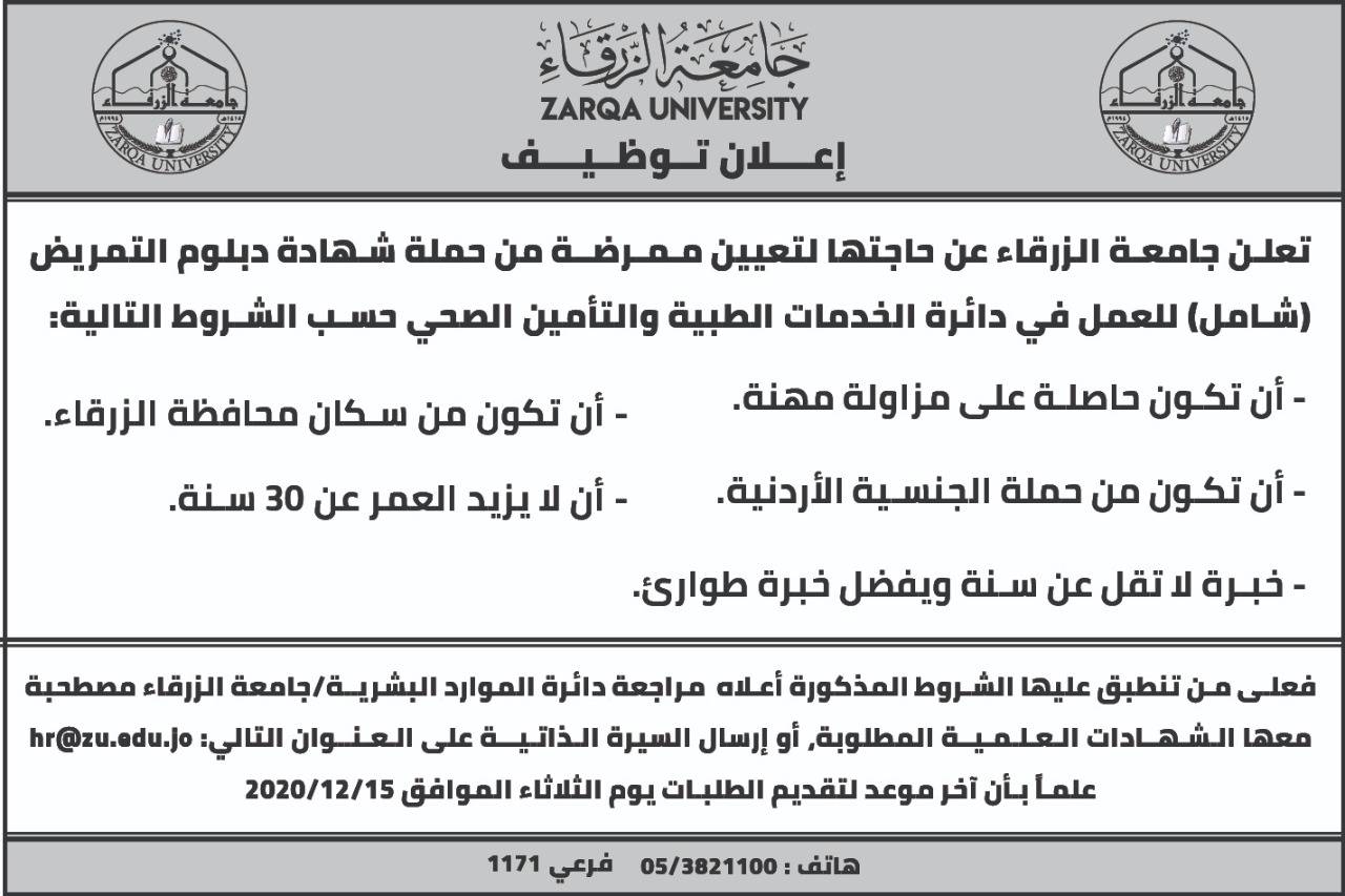 مطلوب ممرضة للعمل في جامعة الزرقاء الخاصة