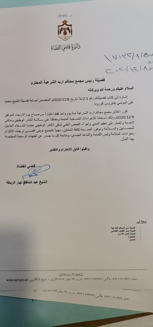 وبينت الوثيقة أنه استنادًا للإجراءات الصحية المتبعة وحفاظًا على سلامة الكادر الوظيفي و متلقي الخدمة والعمل على تعقيم المبنى وإجراء الفحص الطبي لباقي الكادر الوظيفي أنه تقرر اغلاق مجمع محاكم اربد الشرعية مدة يوم واحد اعتبارًا من اليوم .