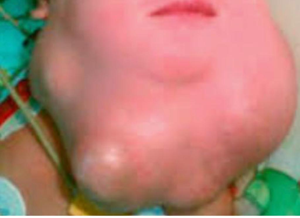 كانت البدايه ملاحظه من قبل الوالدين على عمر سنه، لاحظوا ميل الراس والرقبه وصعوبه في التنفس والاكل والبلع. اتجهوا الى استشاري اطفال بارع الذي قام بإجراء عملية تخفيف الورم . تحسن الطفل لعدة اشهر ولكن سرعان ما بدأ الورم بالتضخم و هذا لكون طبيعة هذا المرض سرعان ما يتضخم ويتكرر،  وازداد التنفس والبلع صعوبه نتيجة تضخم الورم وضغطه على المجاري التنفسيه وعلى البلعوم مع تحول الرقبه الى كتله قاسيه جدا لتحول العضلات الى تكلسات والياف مع ضمور في طول الرقبه الى النصف.
