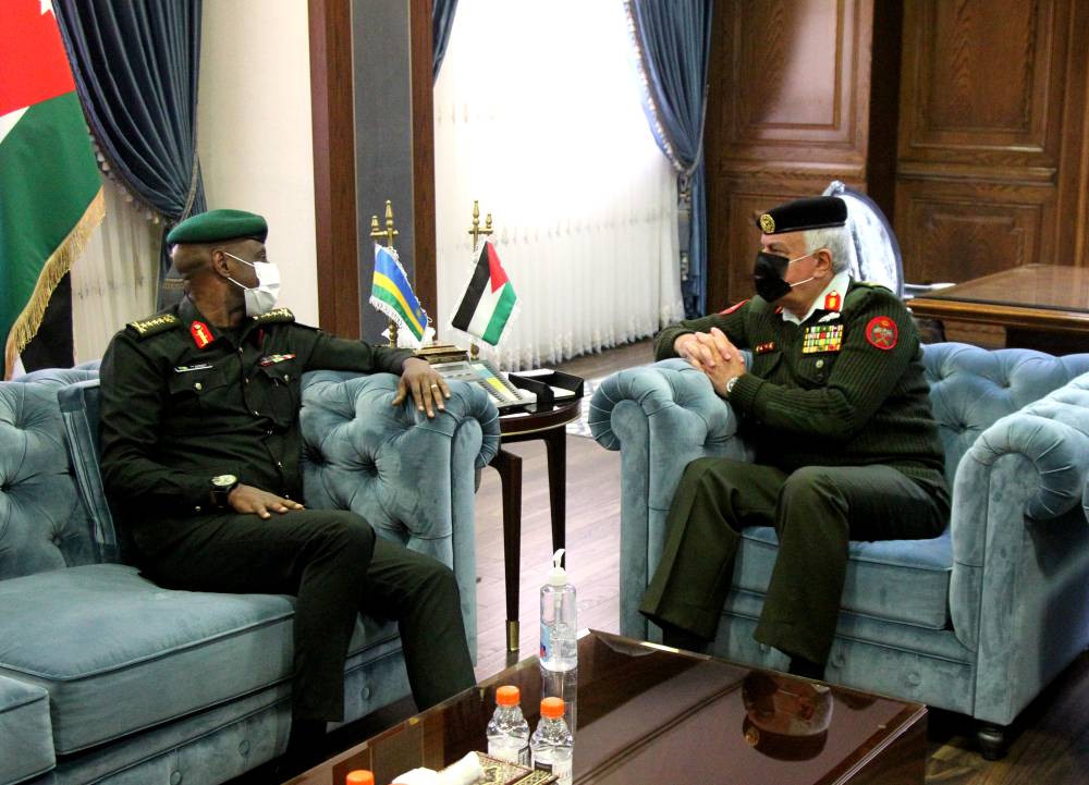 استقبل رئيس هيئة الأركان المشتركة اللواء الركن يوسف أحمد الحنيطي، اليوم الخميس، في مكتبة بالقيادة العامة، رئيس أركان الدفاع للقوات الرواندية الفريق أول جين بوسكو كازورا والوفد المرافق.