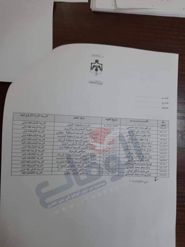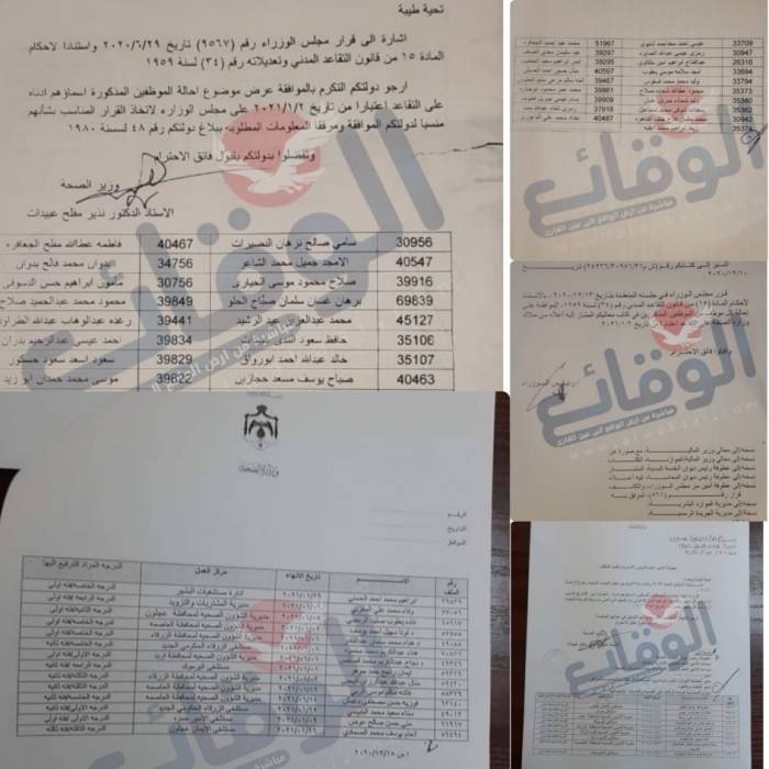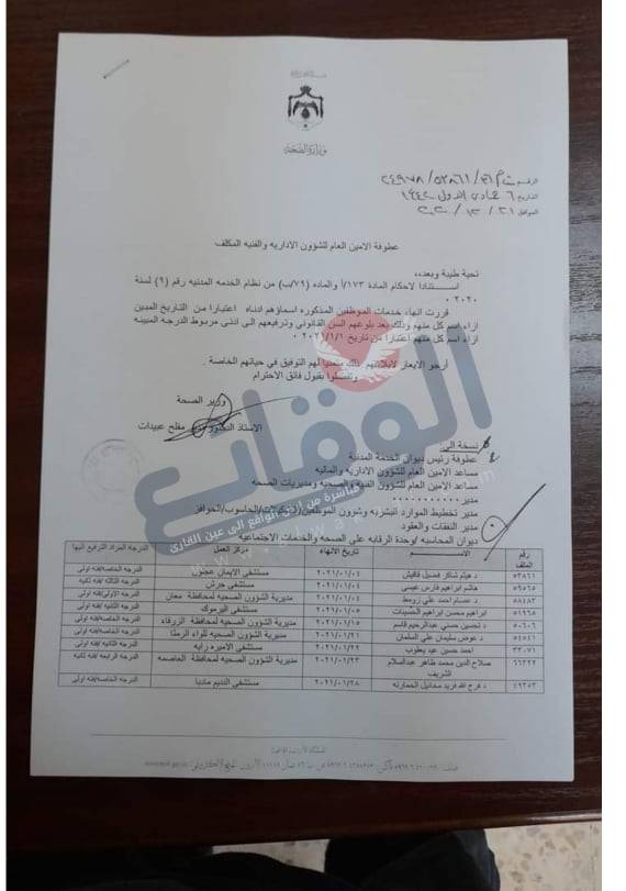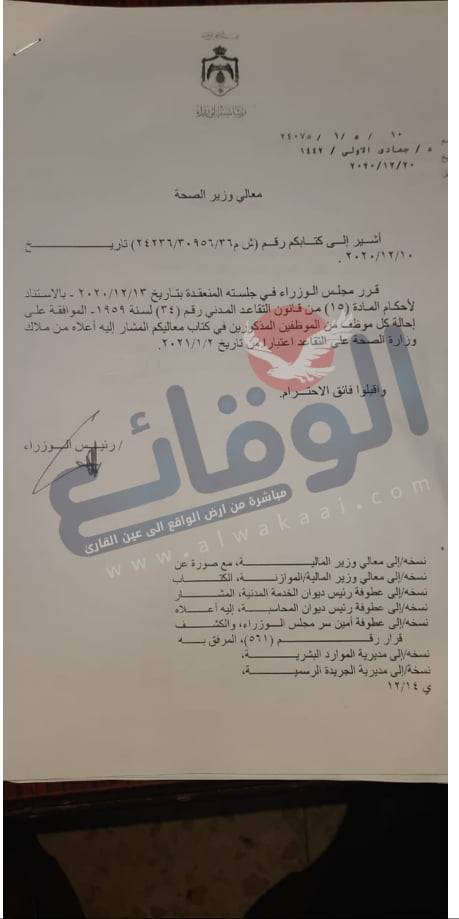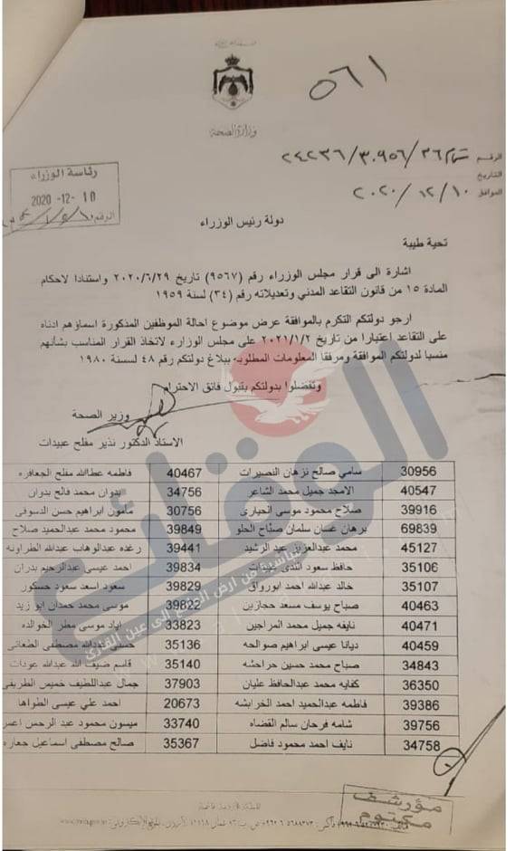 قرر مجلس الوزراء في جلسته المنعقدة بتاريخ ١٣ /١٢ /٢٠٢٠ الموافقة على احالة عدد من الموظفين في وزارة الصحة بناء على تنسيب الوزير د. نذير عبيدات وذلك اعتبارا من التتاريخ ازاء اسم كل موظف.
