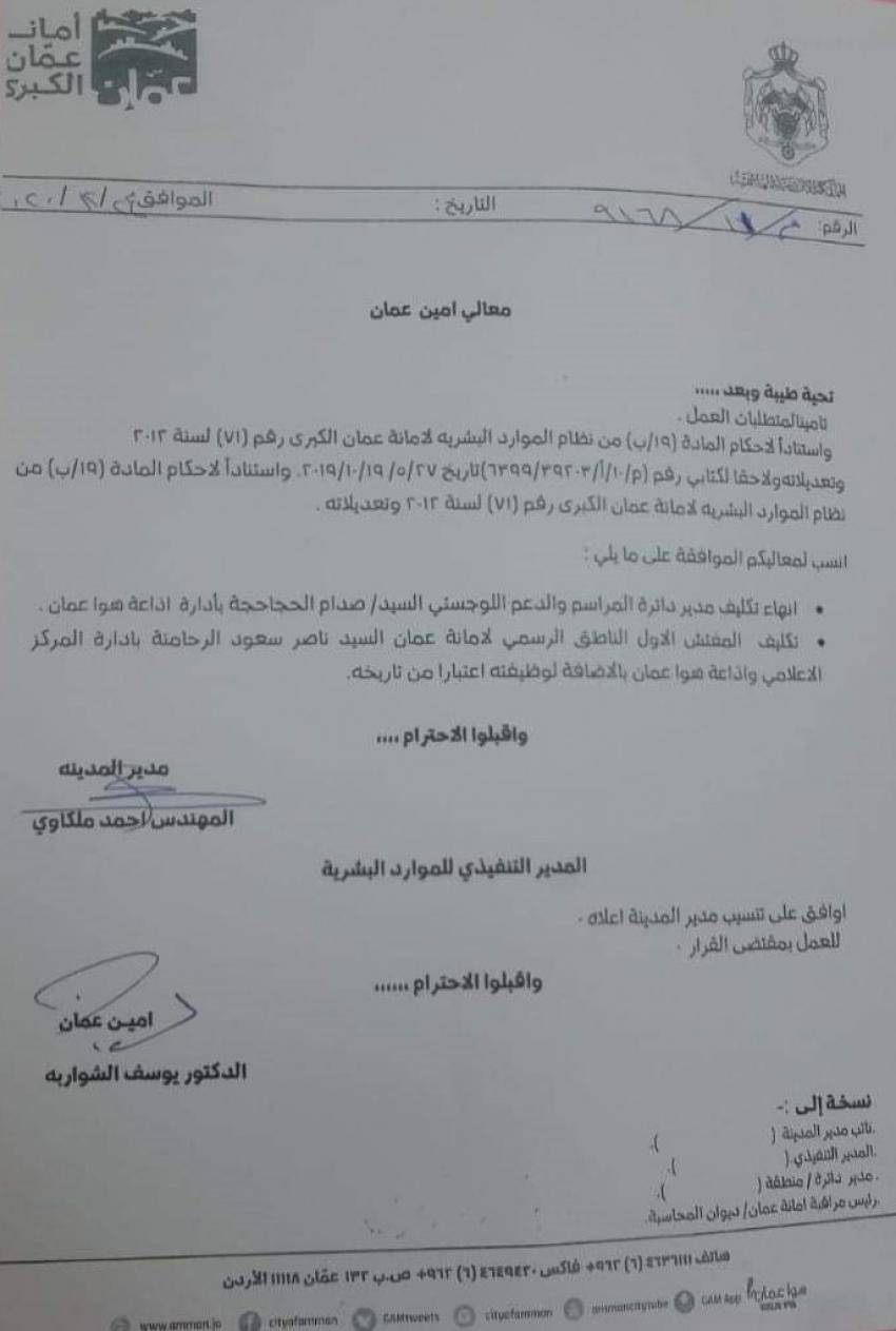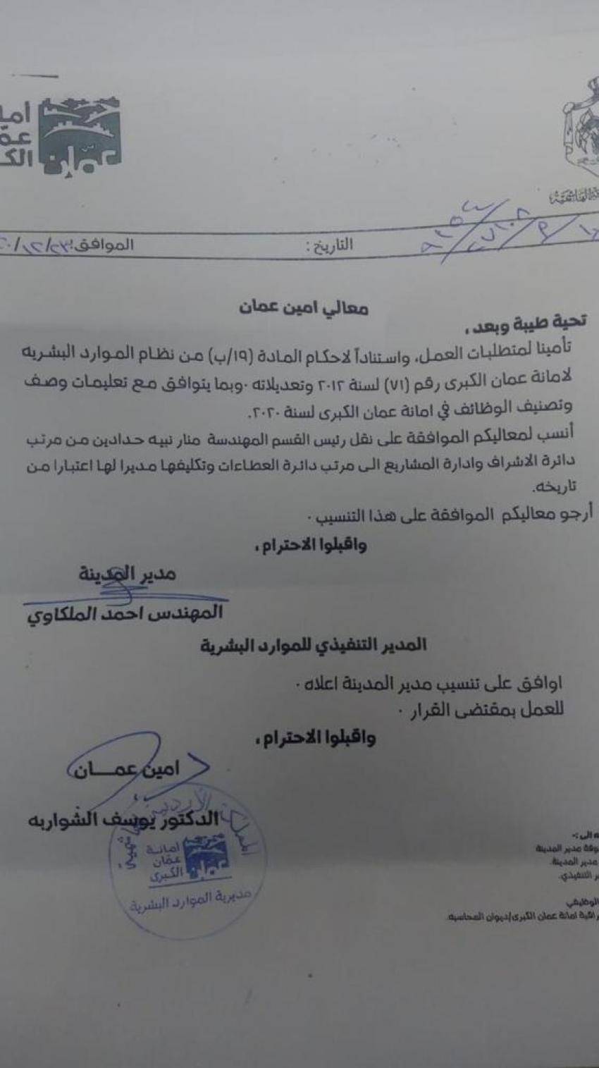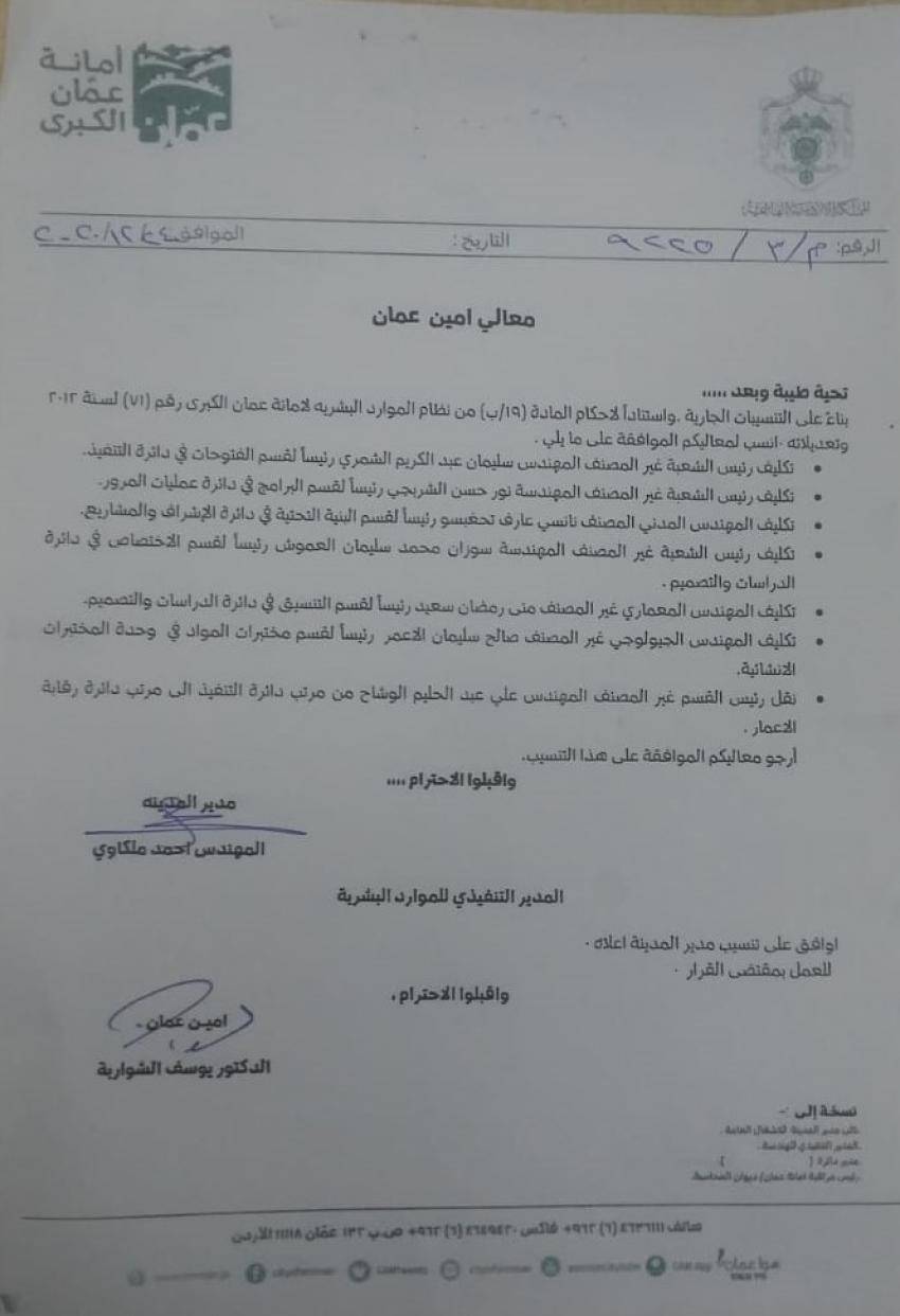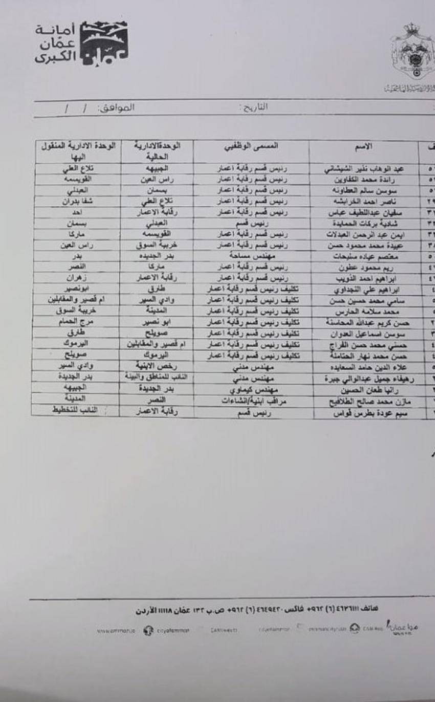 وافق أمين عمان يوسف الشواربة على تنقلات في أمانة عمان الكبرى.