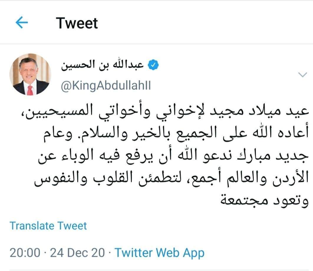 ‏عيد ميلاد مجيد لإخواني وأخواتي المسيحيين، أعاده الله على الجميع بالخير والسلام. وعام جديد مبارك ندعو الله أن يرفع فيه الوباء عن الأردن والعالم أجمع، لتطمئن القلوب والنفوس.