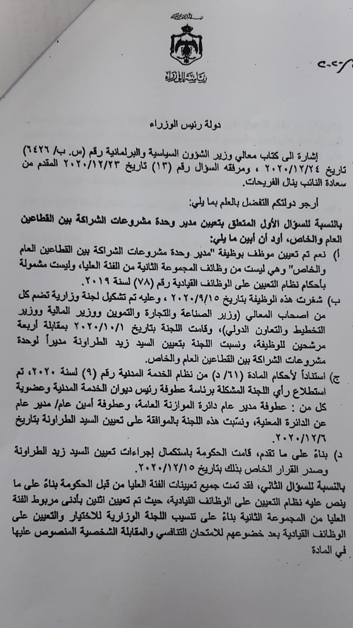 وجاء رد الحكومة بالتأكيد على تعيين زيد فايز الطراونة مديرا لوحدة مشروعات الشراكة بين القطاعين العام والخاص",موضحا الرد الالية التي تمت من حيث تشكيل لجنة وزارية تضم كلا من وزراء التخطيط والصناعة والمالية , واستطلاع رأي اللجنة المشكلة برئاسة رئيس ديوان الخدمة المدنية وعضوية مدير الموازنة العامة والذين نسبوا بالموافقة