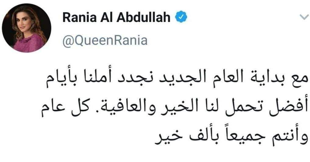 الملكة رانيا تنشر تغريدة عبر تويتر مع دخول العام الجديد