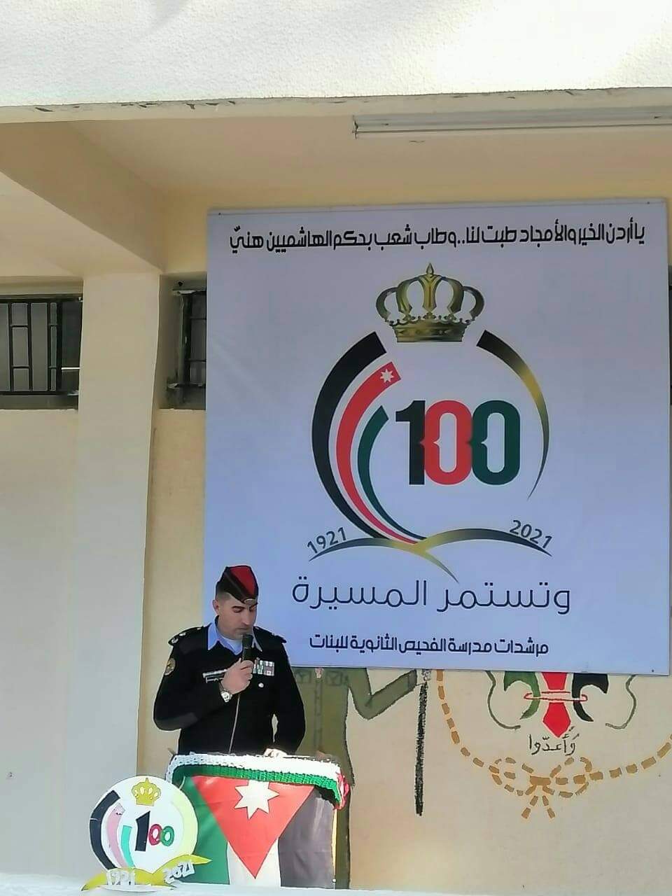 ضمن احتفالات المملكة الاردنية الهاشمية بالذكرى المئوية لتأسيس الدولة الاردنية نظمت مدرسة الفحيص الثانوية الشاملة للبنات بالتعاون مع الشرطة المجتمعية اليوم احتفالا وطنيا بحضور مساعدي مدير تربية البلقاء ومساعد رئيس مركز امن ماحص والفحيص وعدد من معلمات وطالبات المدرسة.
