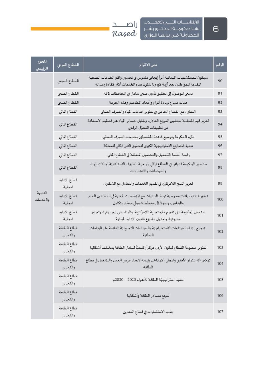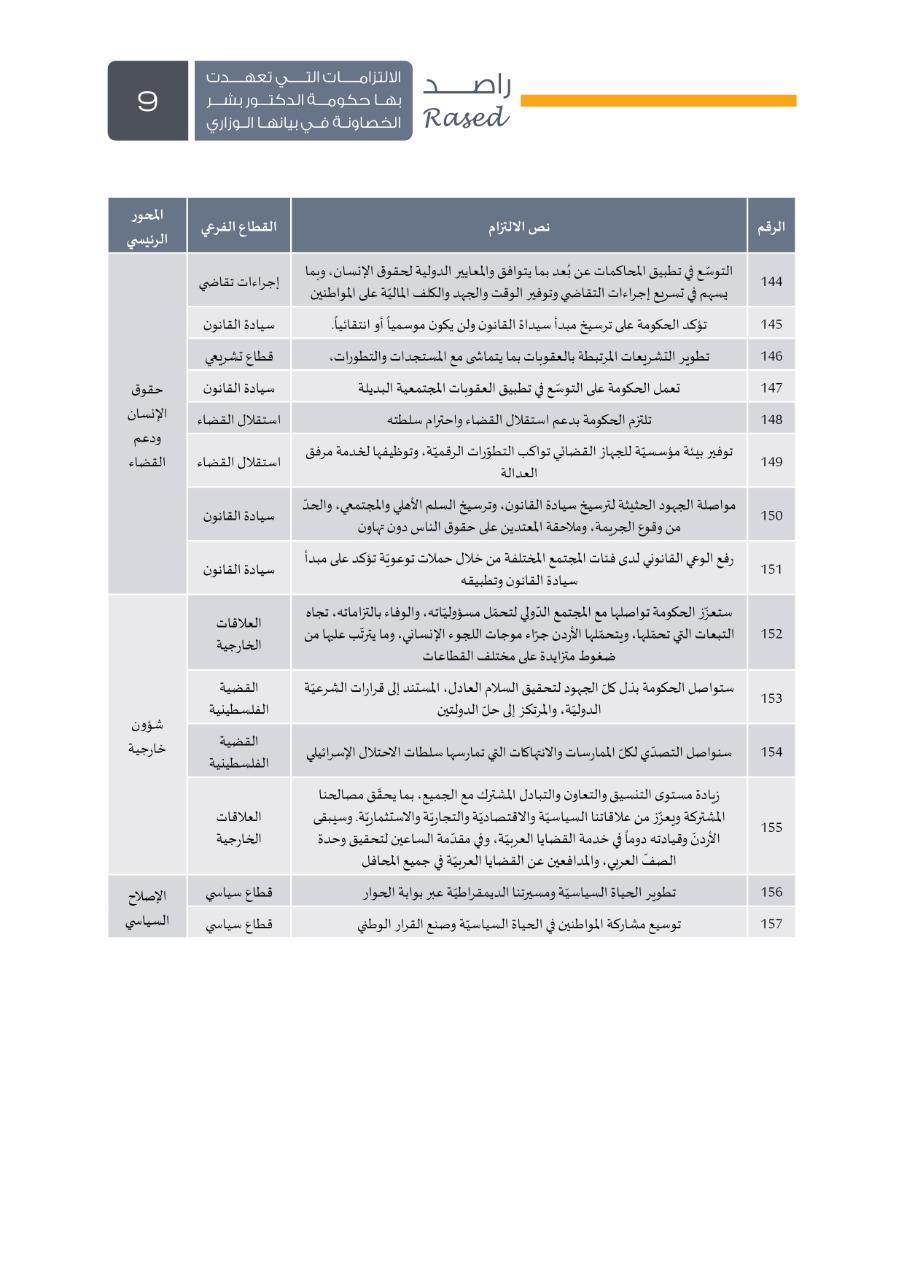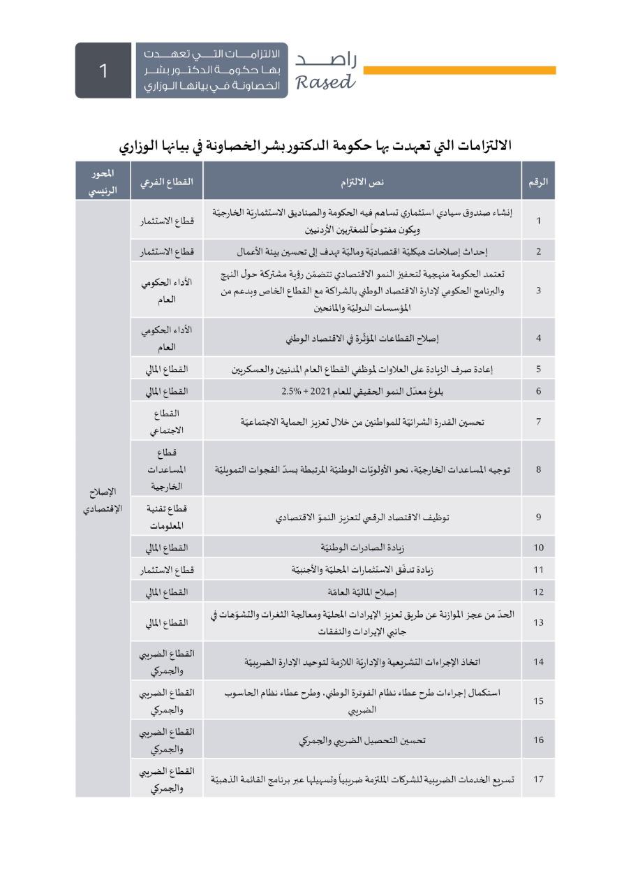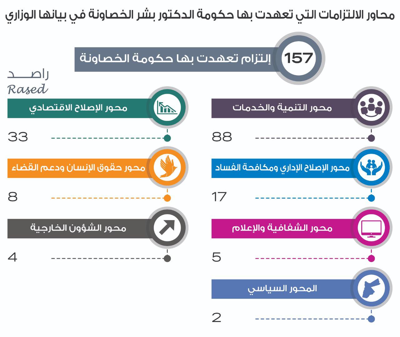 قدمت الحكومة خلال بيانها الوزاري الذي تلته يوم الأحد الموافق 3/1/2020 من خلال رئيس وزرائها الدكتور بشر الخصاونة ما مجموعه 157 التزاماً، وتم تحليل البيان إلى سبعة محاور شاملة وكان محور تعزيز التنمية والخدمات هو الأكثر بعدد الالتزامات بواقع  88 التزاماً، تلاه محور الإصلاح الاقتصادي بـ 33 التزاماً، ثم محور الإصلاح الإداري ومكافحة الفساد بـ 17 التزاماً، ثم محور حقوق الإنسان ودعم القضاء بـ 8 التزامات، ثم محور الشفافية والإعلام بـ 5 التزامات، ومحور الشؤون الخارجية بـ 4 التزامات وأخيراً المحور السياسي بالتزامين فقط.