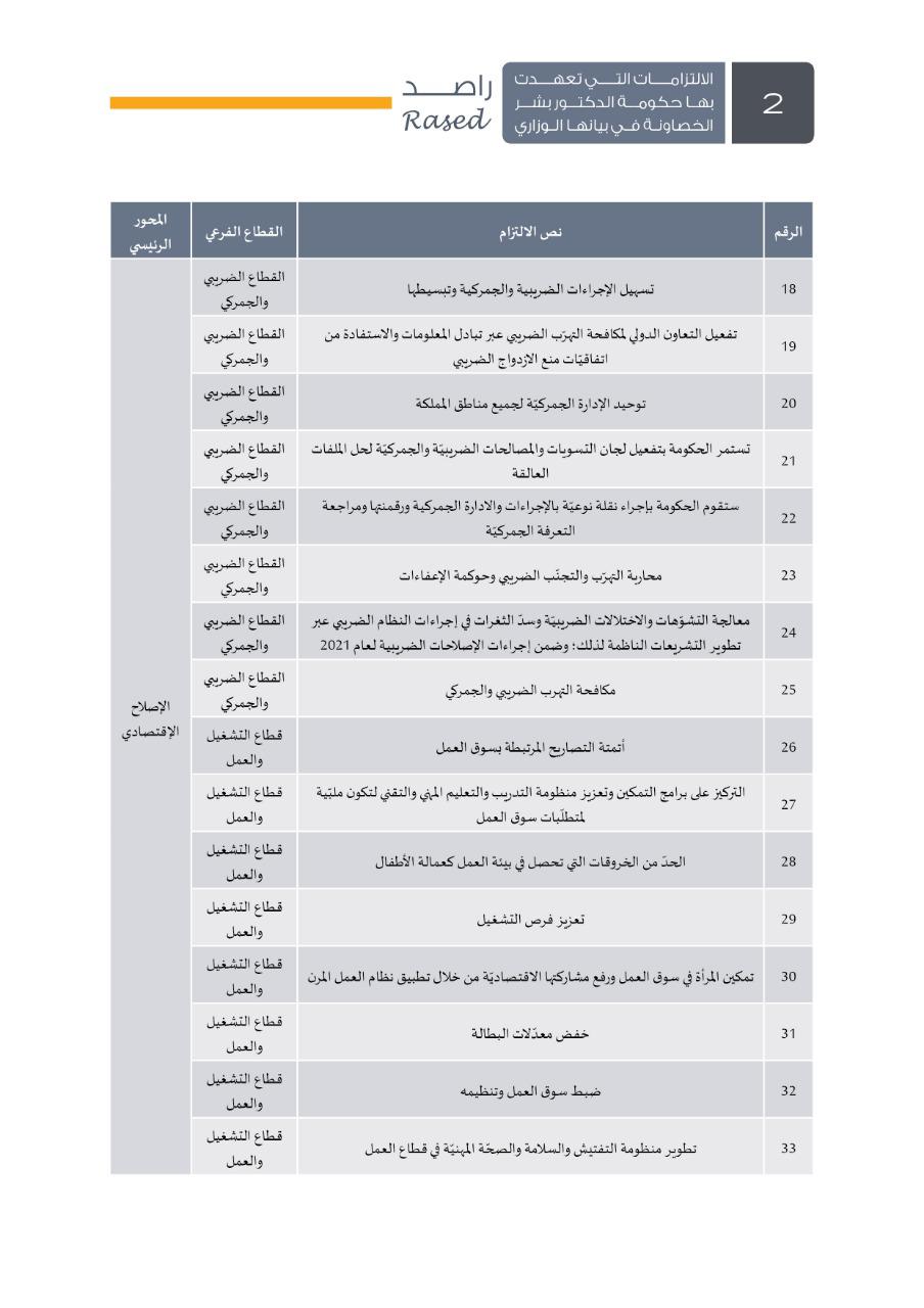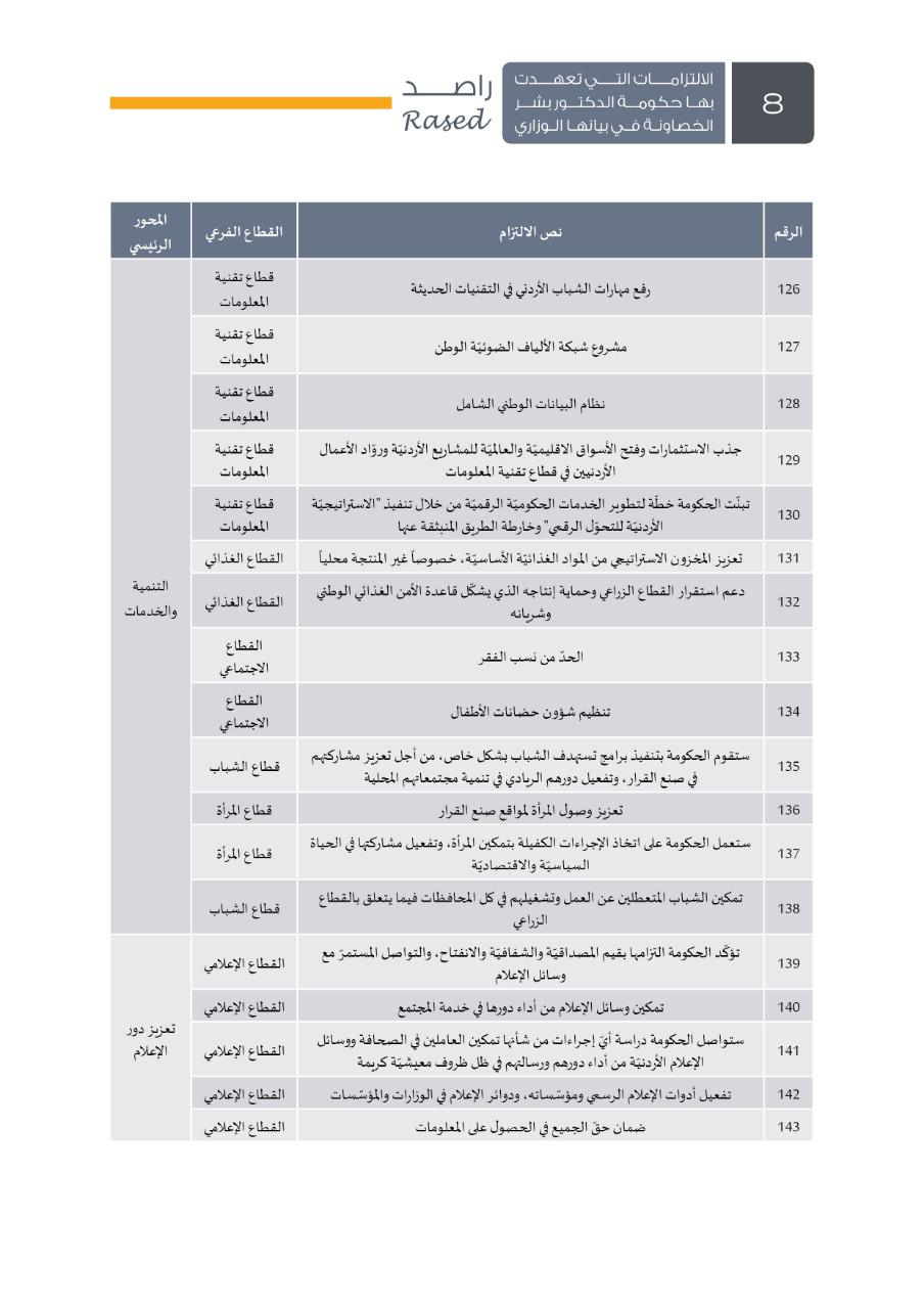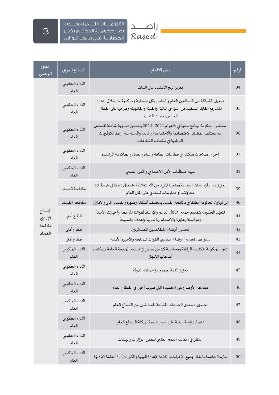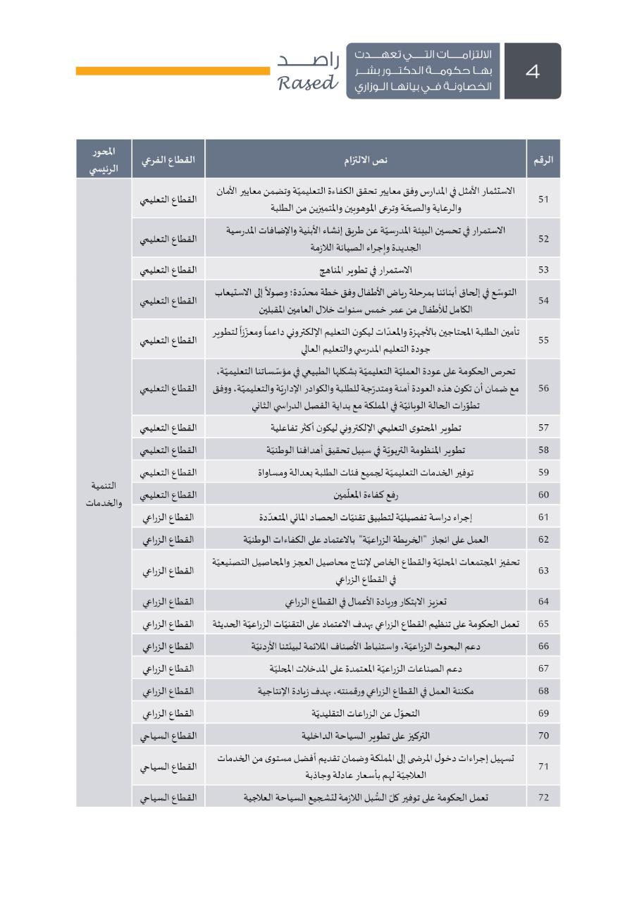 قدمت الحكومة خلال بيانها الوزاري الذي تلته يوم الأحد الموافق 3/1/2020 من خلال رئيس وزرائها الدكتور بشر الخصاونة ما مجموعه 157 التزاماً، وتم تحليل البيان إلى سبعة محاور شاملة وكان محور تعزيز التنمية والخدمات هو الأكثر بعدد الالتزامات بواقع  88 التزاماً، تلاه محور الإصلاح الاقتصادي بـ 33 التزاماً، ثم محور الإصلاح الإداري ومكافحة الفساد بـ 17 التزاماً، ثم محور حقوق الإنسان ودعم القضاء بـ 8 التزامات، ثم محور الشفافية والإعلام بـ 5 التزامات، ومحور الشؤون الخارجية بـ 4 التزامات وأخيراً المحور السياسي بالتزامين فقط.