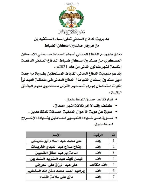 ودعت المديرية العامة للدفاع المدني الضباط المستحقين بضرورة مراجعة أمين سر لجنة صندوق إسكان الضباط / إدارة المالية  لغايات استكمال إجراءات منحهم القرض مصطحبين معهم الوثائق المطلوبة