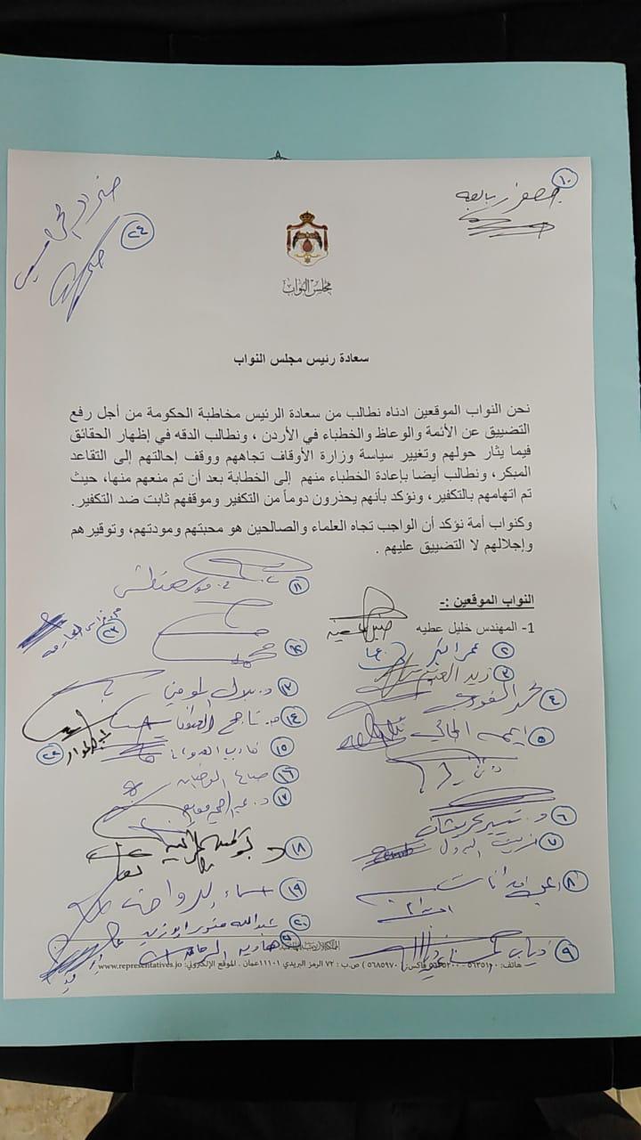 نحن النواب الموقعين ادناه نطالب من سعادة الرئيس مخاطبة الحكومة من أجل رفع التضييق عن الأئمة والوعاظ والخطباء في الأردن ، ونطالب الدقه في إظهار الحقائق فيما يثار حولهم وتغيير سياسة وزارة الأوقاف تجاههم ووقف إحالتهم إلى التقاعد المبكر، ونطالب أيضا بإعادة الخطباء منهم  إلى الخطابة بعد أن تم منعهم منها، حيث تم اتهامهم بالتكفير، ونؤكد بأنهم يحذرون دوماً من التكفير وموقفهم ثابت ضد التكفير.