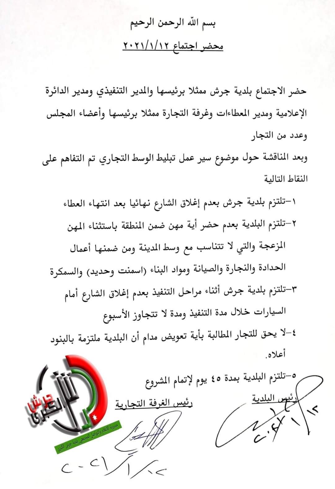 وبحسب المذكرة فان البلدية تلتزم بعدم اغلاق الشارع بعد انتهاء العطاء وعدم حضر أي مهن ضمن المنطقة باستثناء المهن المزعجة والتي لا تتناسب مع وسط المدينة ومن ضمنها اعمال الحدادة والنجارة والصيانة ومواد البناء والسمكرة .