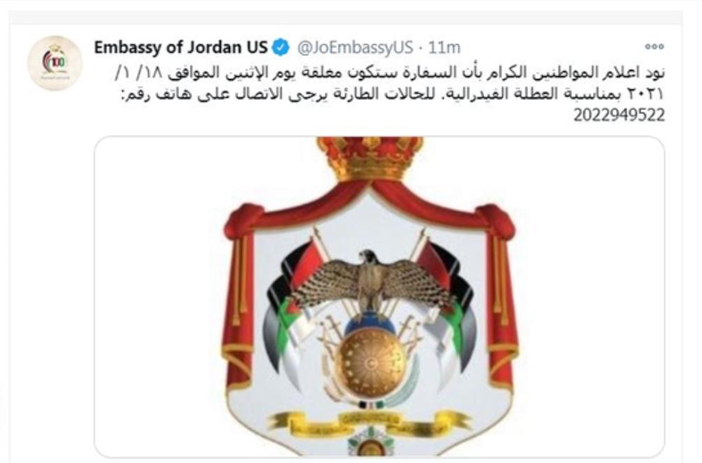 قالت السفارة الأردنية لدى امريكا عبر تويتر أنها تود اعلام المواطنين الكرام بأن السفارة ستكون مغلقة يوم الاثنين الموافق 2024/1/18 .