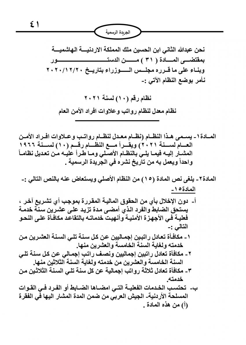 صدر في عدد الجريدة الرسيمة اليوم الاحد إرادة ملكية سامية بوضع النظام المعدل لنظام رواتب وعلاوات الامن العام. وتالياً نص النظام: