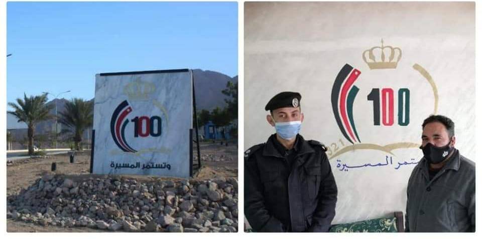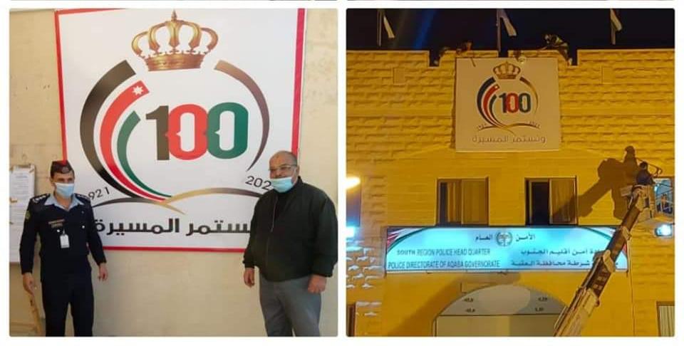ضمن احتفالات المملكة الأردنية الهاشمية بذكرى مئوية التأسيس قامت الشرطة المجتمعية في اقليم الجنوب واستمراراً للمبادرة التي أطلقتها منذ بداية العام الحالي بتوجيه من قائد امن اقليم الجنوب العميد الدكتور جهاد القضاة، برسم جداريات ووضع اليافطات الخاصة بشعار المئوية في عدد من المناطق.