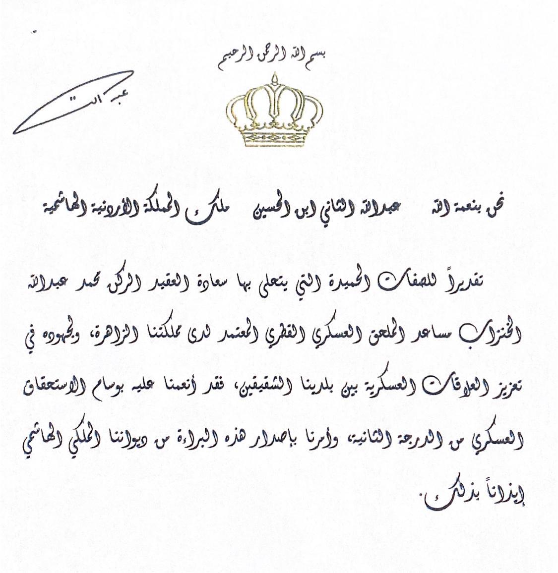 جلالة الملك عبدالله الثاني ابن الحسين ينعم على العقيد الركن محمد بن عبدالله الحنزاب مساعد الملحق العسكري السابق لدولة قطر في الأردن بوسام الاستحقاق العسكري من الدرجة الثانية تكريماً له وتقديراً للصفات الحميدة التي يتحلى بها ولجهوده المتميزة في تعزيز العلاقات العسكرية المشتركة بين البلدين الشقيقين