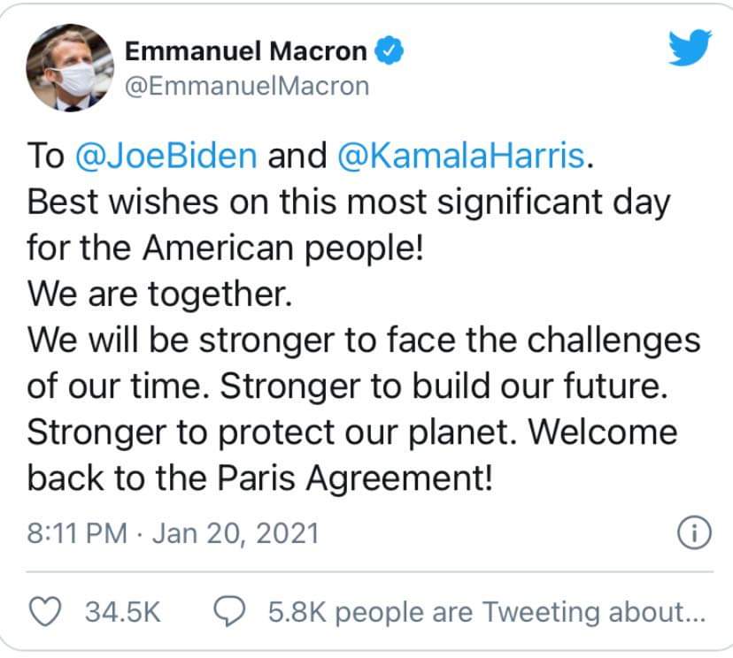 تمنى الرئيس الفرنسي إيمانويل ماكرون ، في تغريدة بالإنكليزية لجو بايدن "كل التوفيق” بعد تنصيبه رئيسا جديدا للولايات المتحدة، مرحّباً بقراره العودة إلى اتفاق باريس للمناخ الذي انسحبت منه واشنطن في عهد دونالد ترامب.