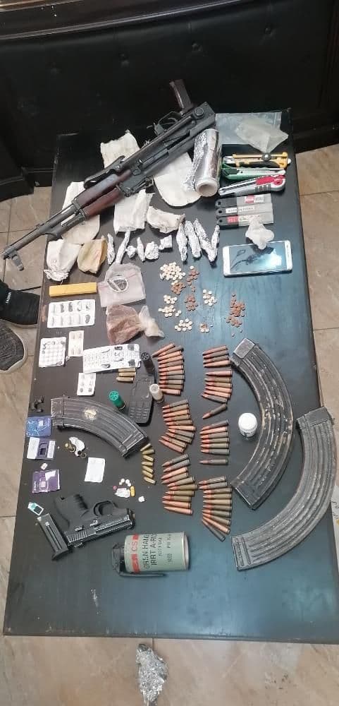 ** ضبط مروج مطلوب مصنف بالخطير في محافظة الكرك وبحوزته سلاحان ناريان وكميات كبيرة من المواد المخدرة .