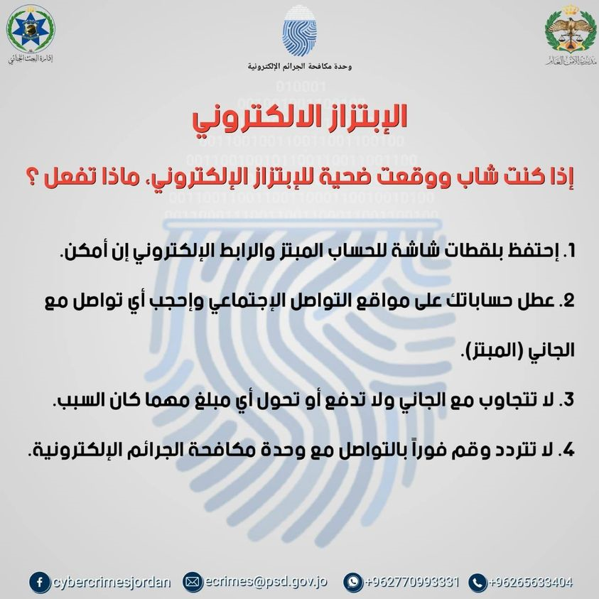 نشرت وحدة مكافحة الجرائم الالكترونية رسالة للمواطنين حول كيفية التصرف اذا وقعت ضحية لـ الابتزاز الالكتروني.