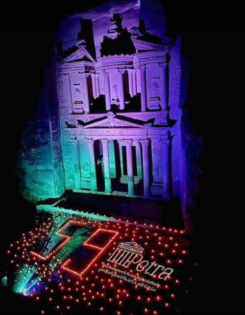 وقال رئيس إقليم البترا الدكتور سليمان الفرجات، إن الاحتفال يأتي، تعبيرا عن اعتزاز المدينة الوردية بالقيادة الهاشمية، مشيرا إلى أن المدينة حققت في عهد جلالته الكثير من الانجازات الهامة، التي جعلت منها وجهة سياحية ذات مكانة خاصة على خارطة السياحة العالمية. وأشار الفرجات إلى الدعم الملكي المتواصل للبترا وجهود رعايتها محلياً وتسويقها عالمياً . وتعمل سلطة إقليم البترا على إضاءة المدينة في العديد من المناسبات الوطنية، وحملت إضاءة المعلم خلال هذا الاحتفال وسم #59.