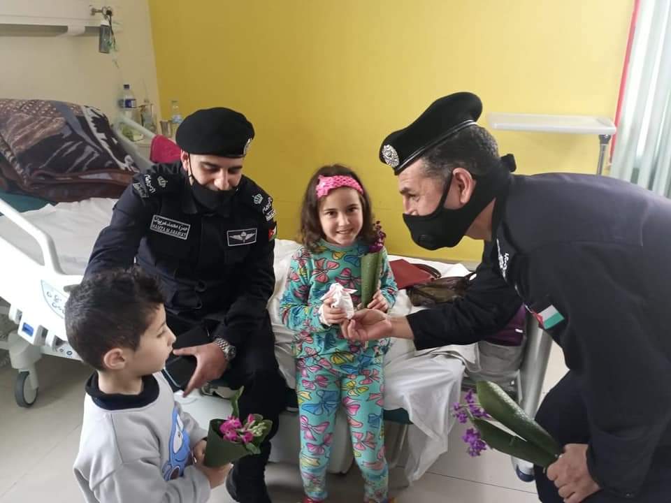 فيما قامت الشرطة المجتمعية في مديرية شرطة إربد وبالتشاركية مع أعضاء المجلس الأمني المحلي في مركز أمن إربد الغربي وبحضور رئيس المركز الأمني بتوزيع الورود والحلوى على الأطفال الذين يرقدون على سرير الشفاء في مستشفى الأميرة رحمة التعليمي وتقديم التهاني لهم ولذويهم بهذه المناسبة الوطنية الغالية .