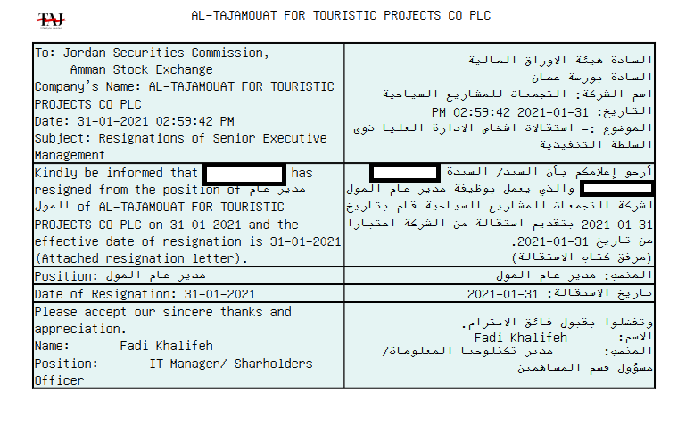 ووفق الافصاح الذي اطلعت عليه سرايا فإن مدير عام الشركة السيدة "م،ع" قد قدمت استقالتها بتاريخ 31/1/2021، وتكونالاستقالة نافذة اعتباراً من ذات اليوم.