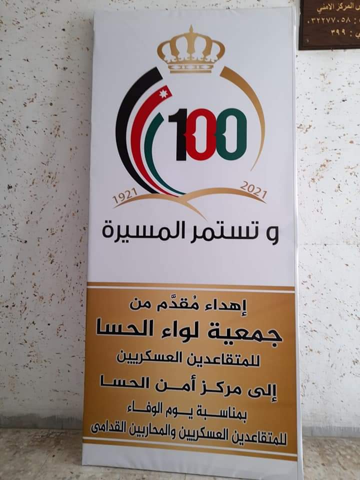 ضمن احتفالات المملكة الأردنية الهاشمية بالمناسبات الوطنية، قامت جمعية لواء الحسا للمتقاعدين العسكريين وبالتنسيق مع الشرطة المجتمعية بتقديم عدد من اللوحات التي تحمل شعار مئوية التأسيس لعدد من وحدات الأمن العام في محافظة الطفيلة تعبيراً عن اعتزاز وافتخار المتقاعدين العسكريين بتلك المناسبات الوطنية العزيزة.