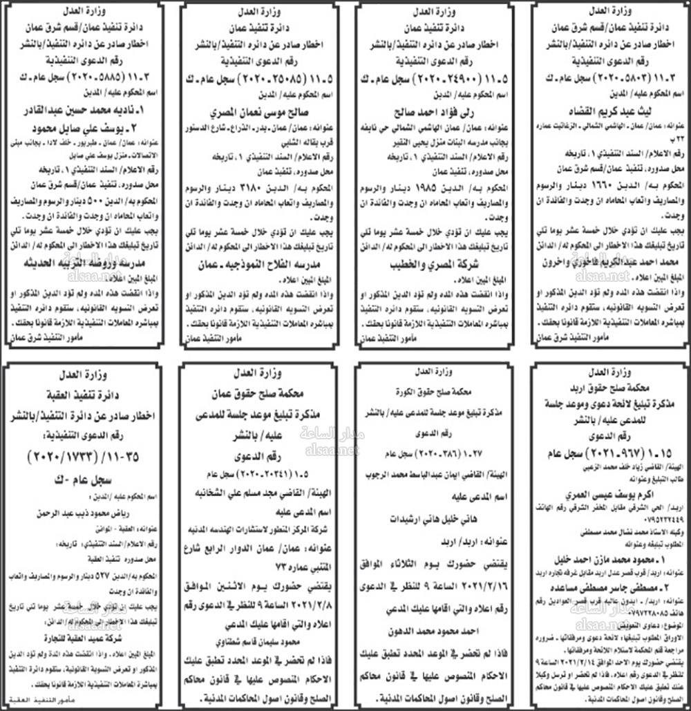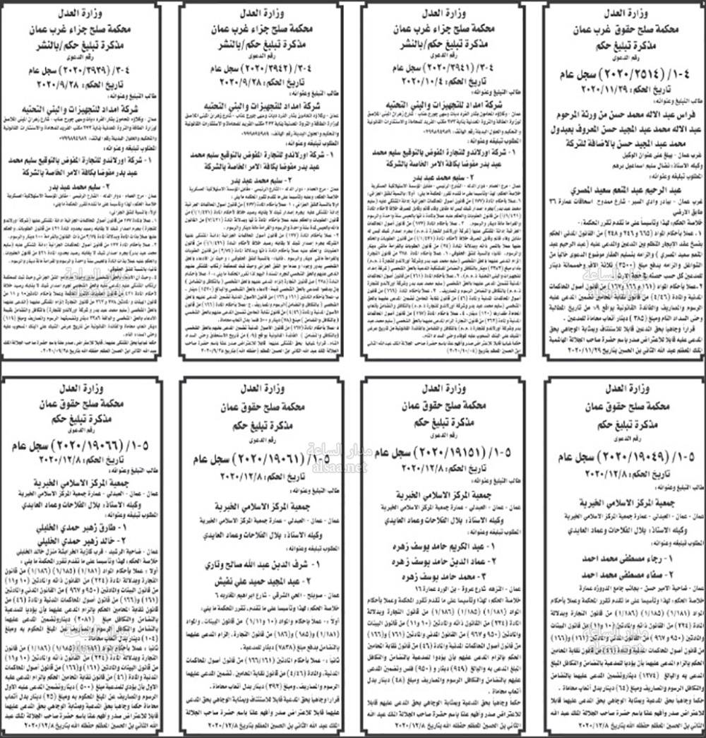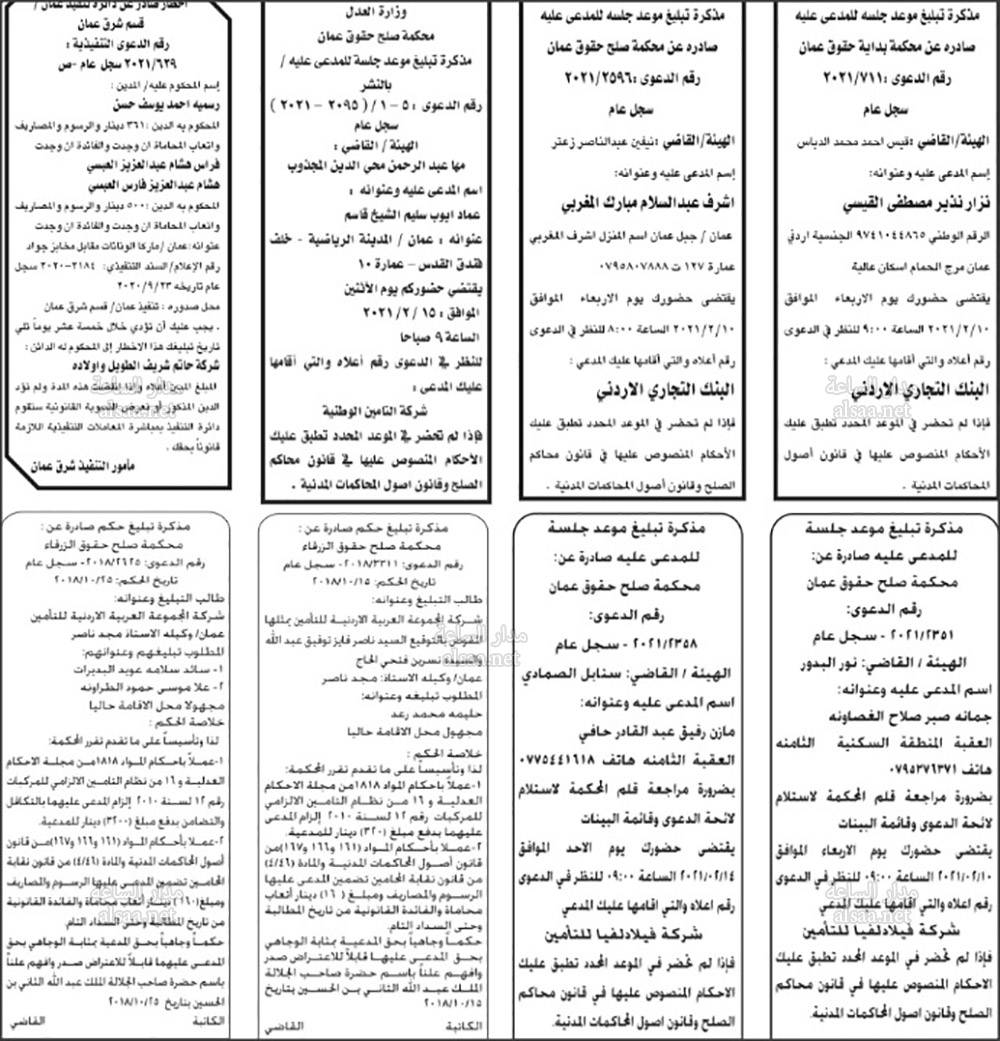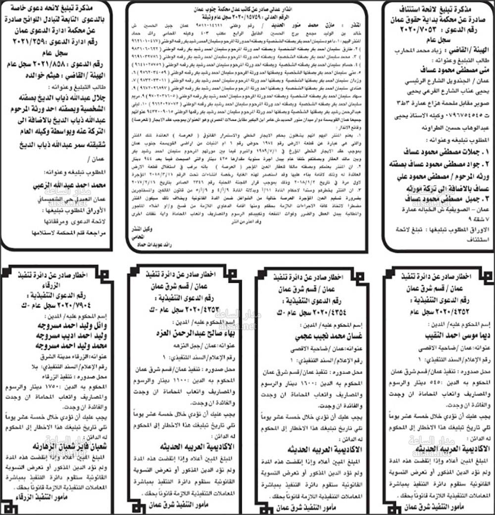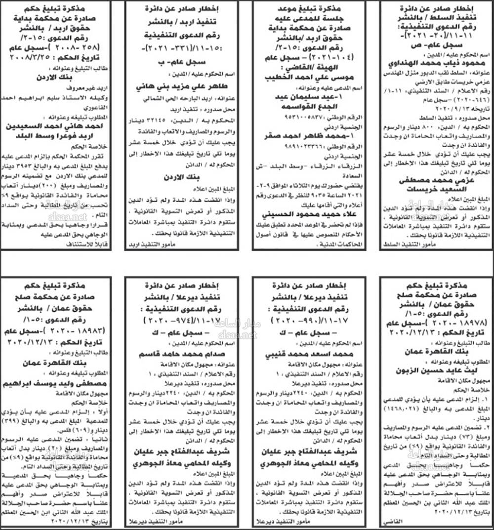 أعلنت محاكم عن مذكرات تبليغ مواعيد جلسات المحاكمة للمشتكى عليهم المذكورين تاليا. وطلبت المذكرات مراجعة المحاكم المبينة إزاء اسم كل منهم في المواعيد المبينة أدناه. كما صدرت اخطارات عن دوائر التنفيذ في المحاكم.