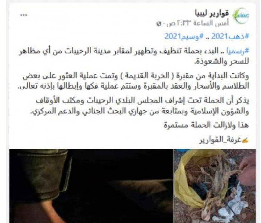 يشار إلى أن أعمال السحر والشعوذة تم تسليط الضوء عليها كثيرا خلال الفترة الماضية في ليبيا، وتم تناقل فيديوهات توثق ما قيل إنها رموز وطلاسم سحر تم دفنها في المقابر او في آبار سحيقة داخل تلك المقابر.